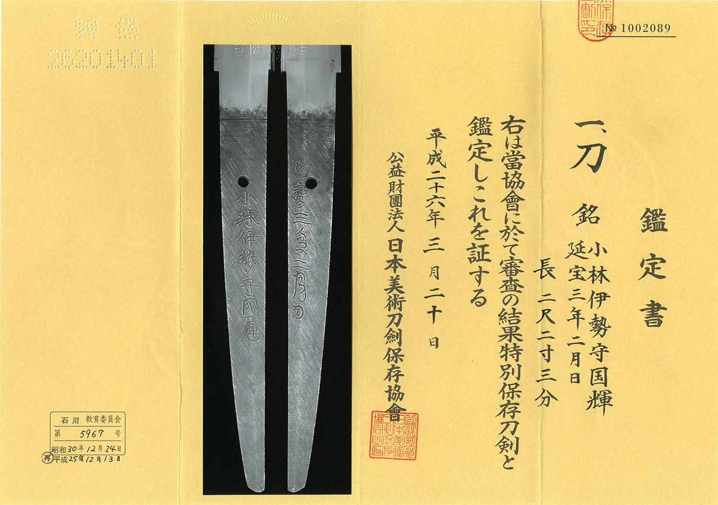 | katana > SwordAS25731 Katana:Kobayashi Ise Kami Kuniteru. Enpo 3 Nen 2 Gatsu hi (the blade was made at Enpo3rd (1674)February)(NBTHK Tokubetsu Hozon paper) | | ¥1,200,000 | bid count:- |
