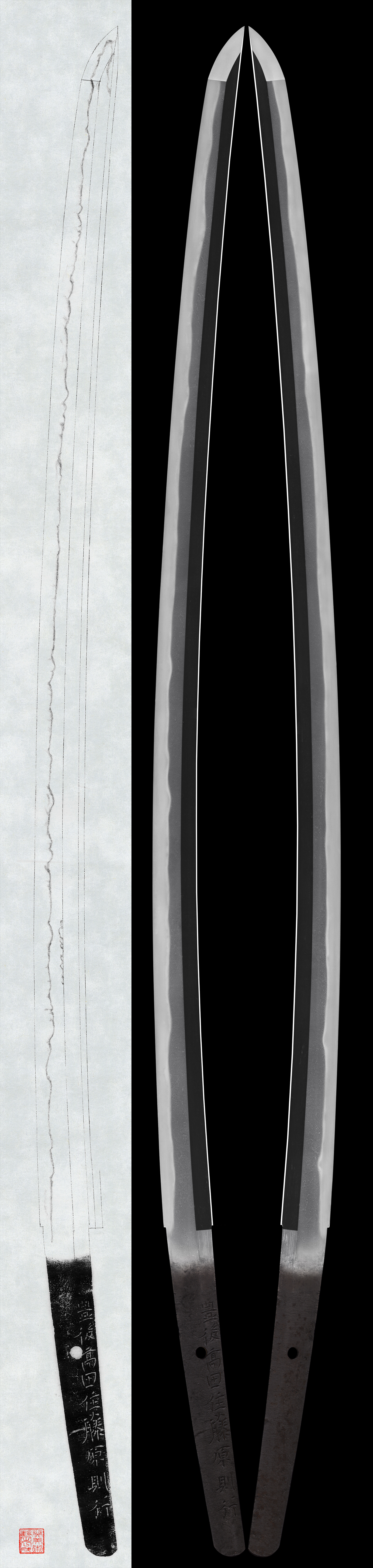 Features: Noriyuki was a swordsmith of the Takada school during the Edo period. The first and second generations produced swords with flamboyant midare hamon, and from the third generation onward, however, the hamon tended to become more subdued.