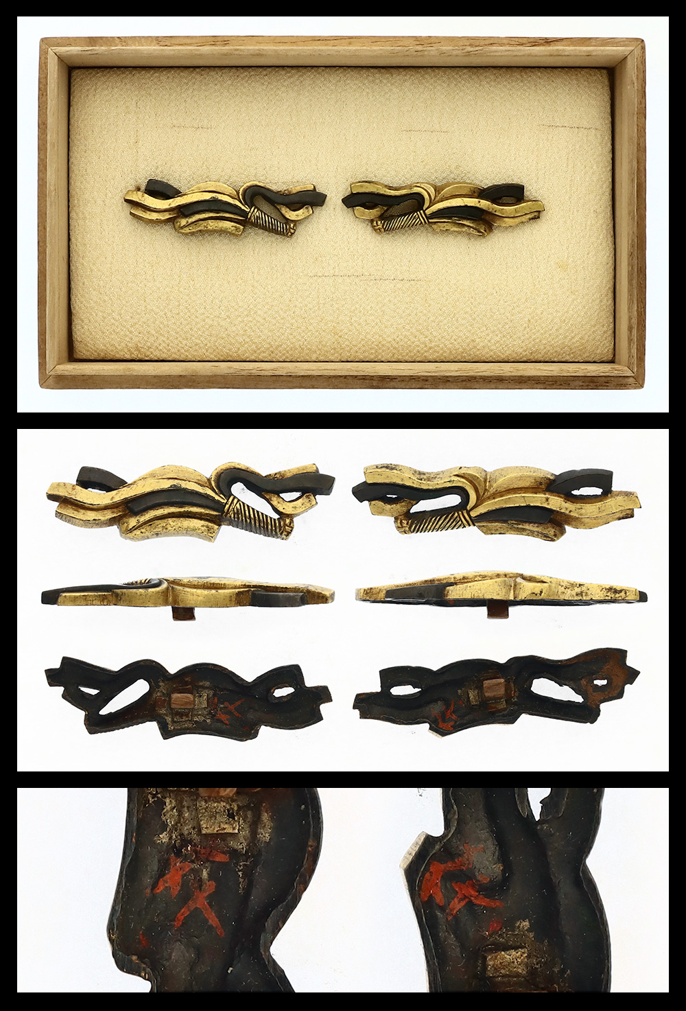 Features: Carved in relief with a design of bundled noshi on a shakudo ground, embellished with gold inlay.