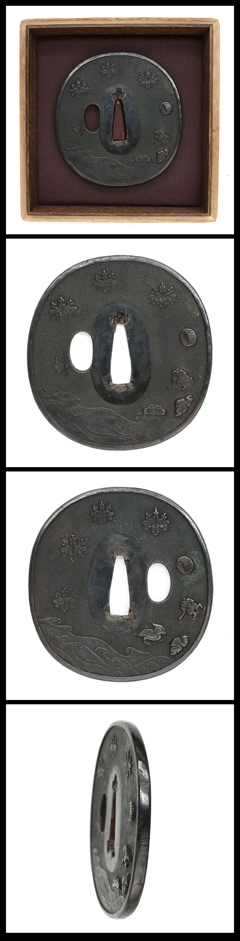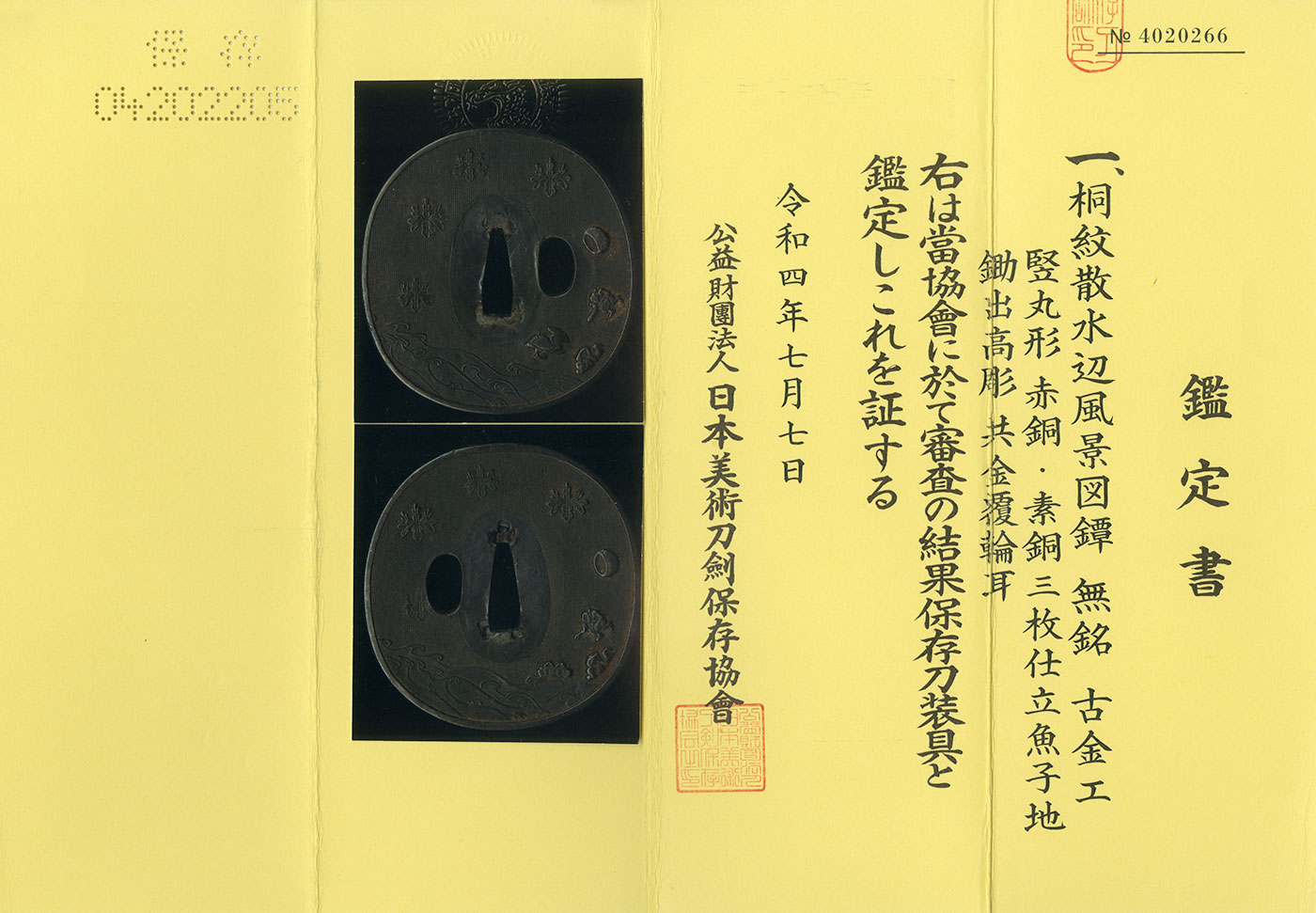 Features: Scattered Paulownia Crests with Waterside Landscape is depicted on Shakudo nanako copper base.