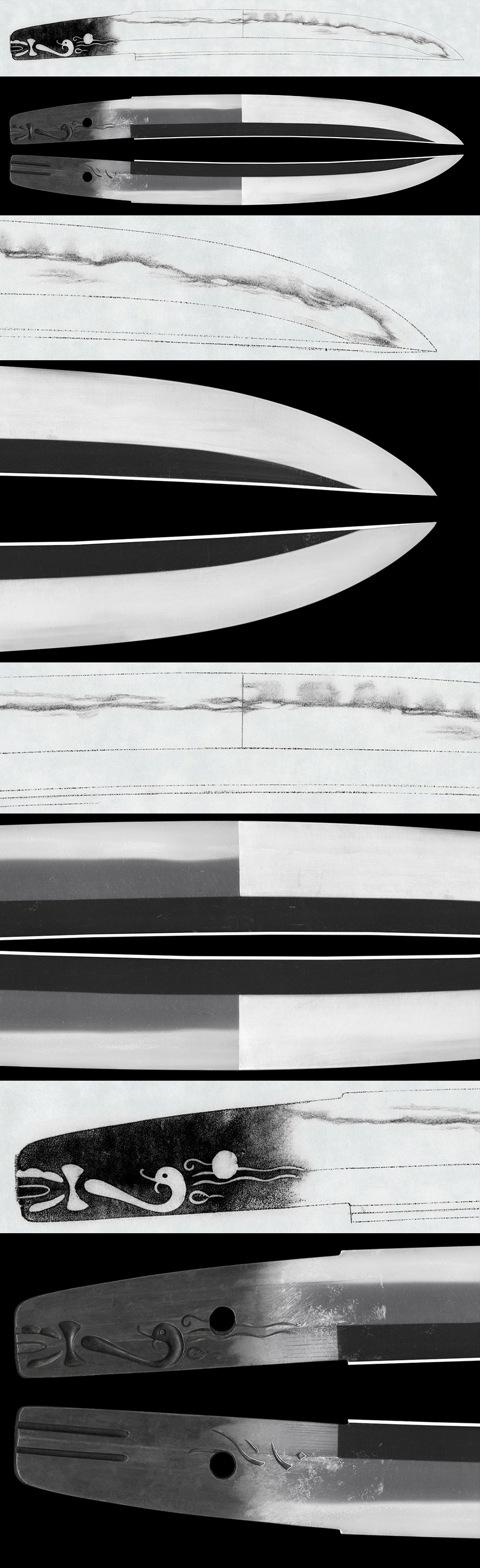 Carvings are present on both sides of the tang (nakago), and there is evidence of suriage and a modified machi.