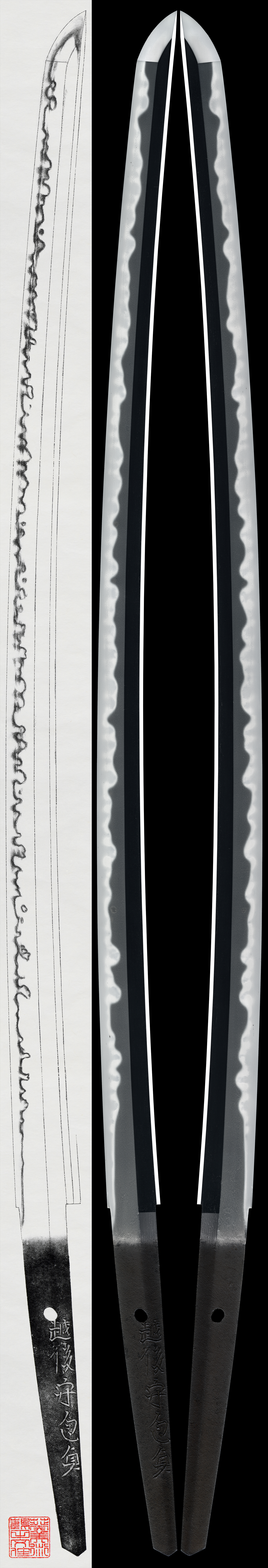 Features: Echigo no Kami Kanesada imitated the style of the second-generation Sukehira, producing gunome-midare.
