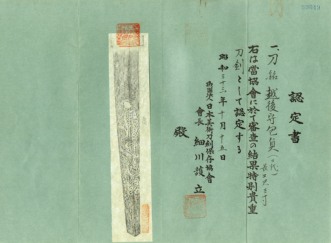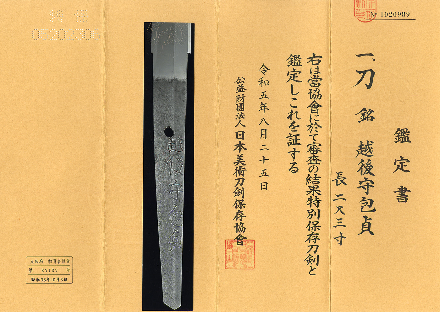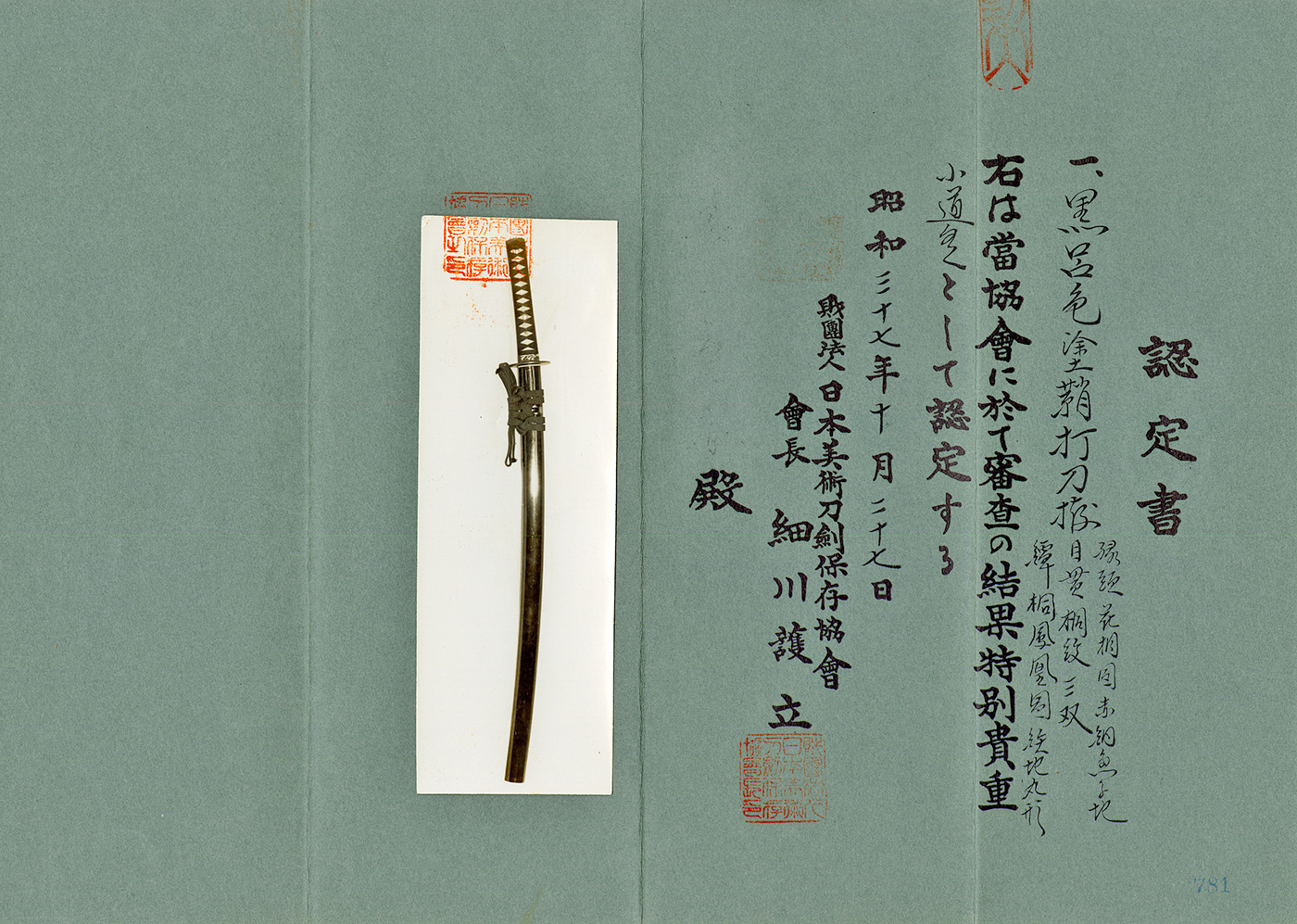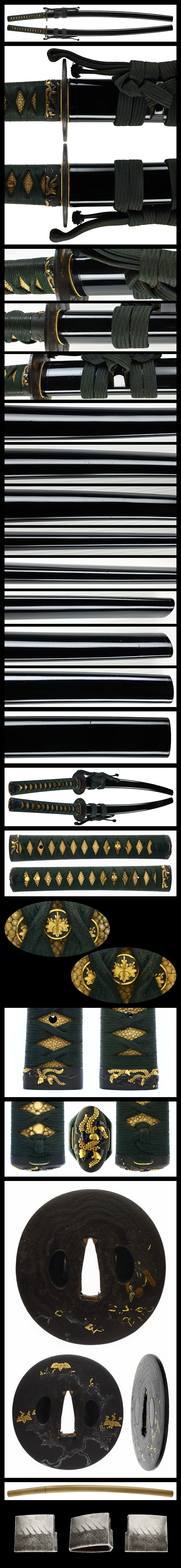 Katana in Shirasaya with Koshirae (NBTHK Tokubetsu Hozon Token) (NBTHK Tokubetsu Kicho Token) Koshirae: (NBTHK Tokubetsu Kicho Kodogu)Tsuba: (NBTHK Tokubetsu Kicho Kodogu)Fuchikashira: (NBTHK Tokubetsu Kicho Kodogu)Menuki: (NBTHK Tokubetsu Kicho Kodogu)