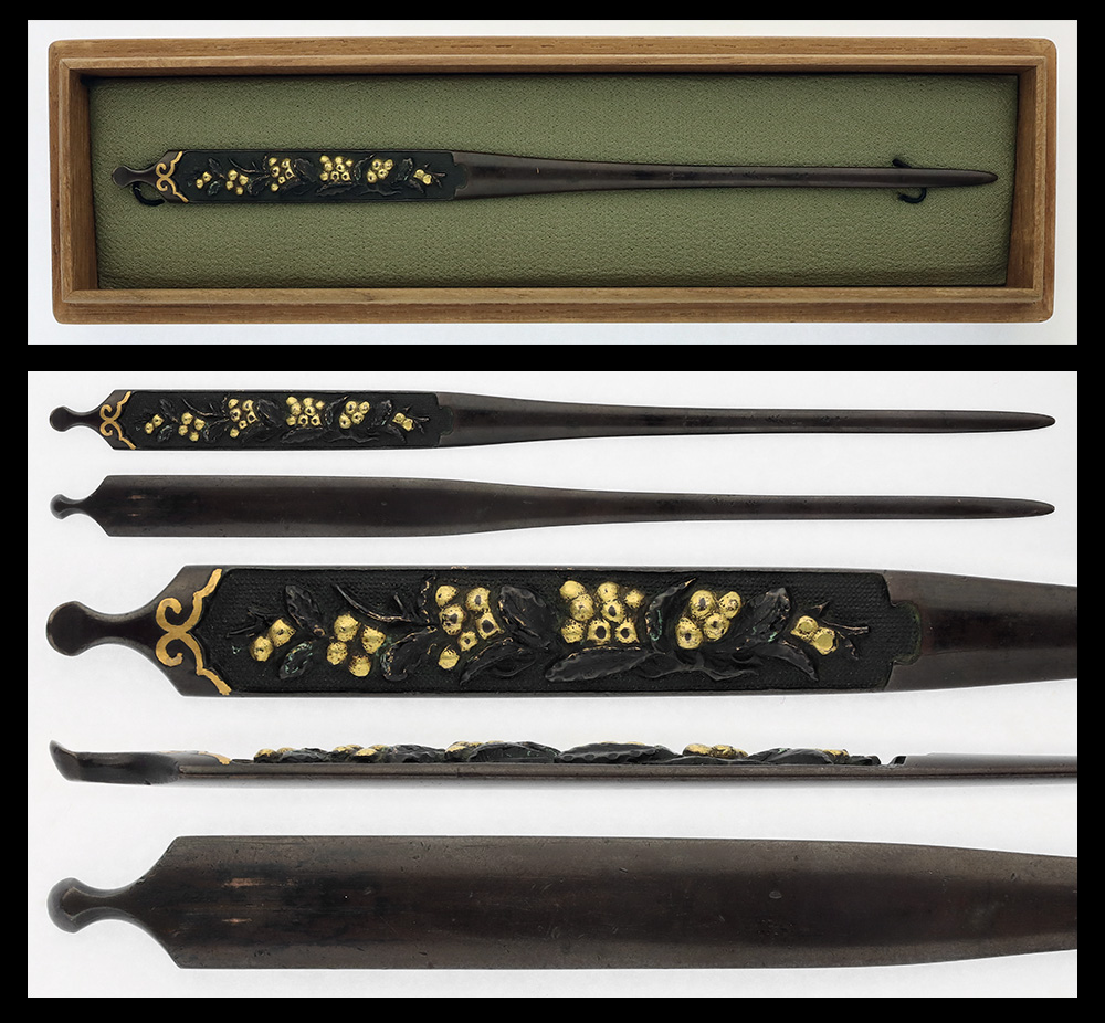 Features: Loquats are depicted in high relief with gold detailing on a shakudō nanako ground.