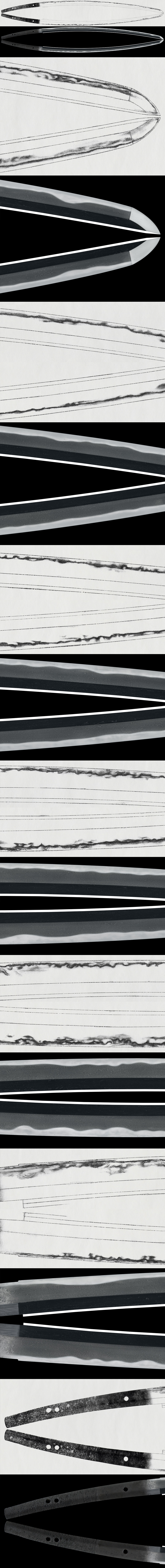 Hamon:Nie-based small gunome-midare with thick and soft nioikuchi, small nie, active kinsuji and sunagashi.