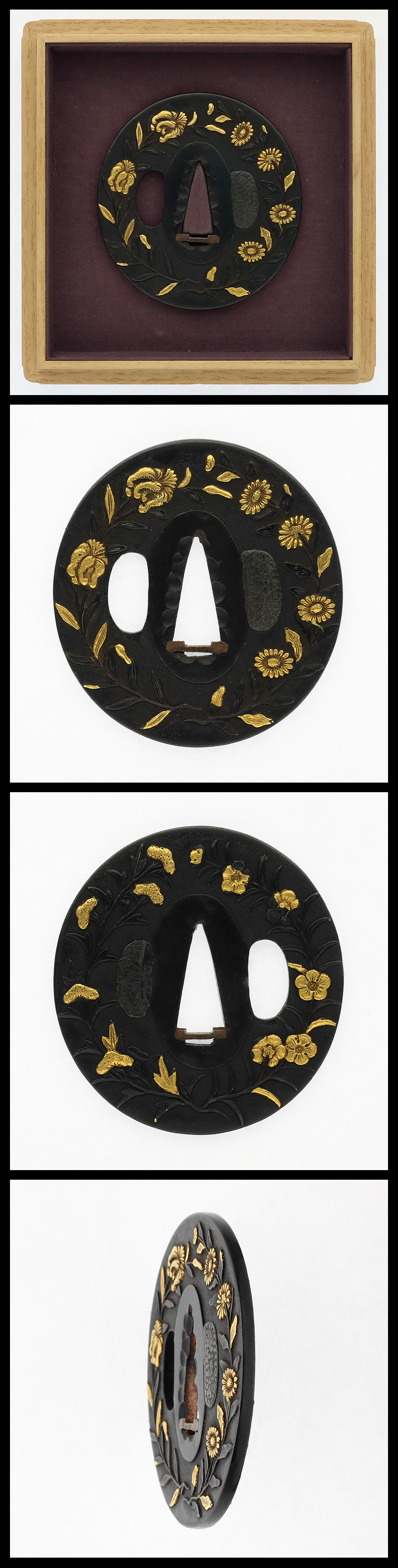 Features: Autumn grasses are carved in sukidashi-bori on a shakudo nanako ground, set into an iron tate-maru gata base. Gold inlay and iroe (colored) details.