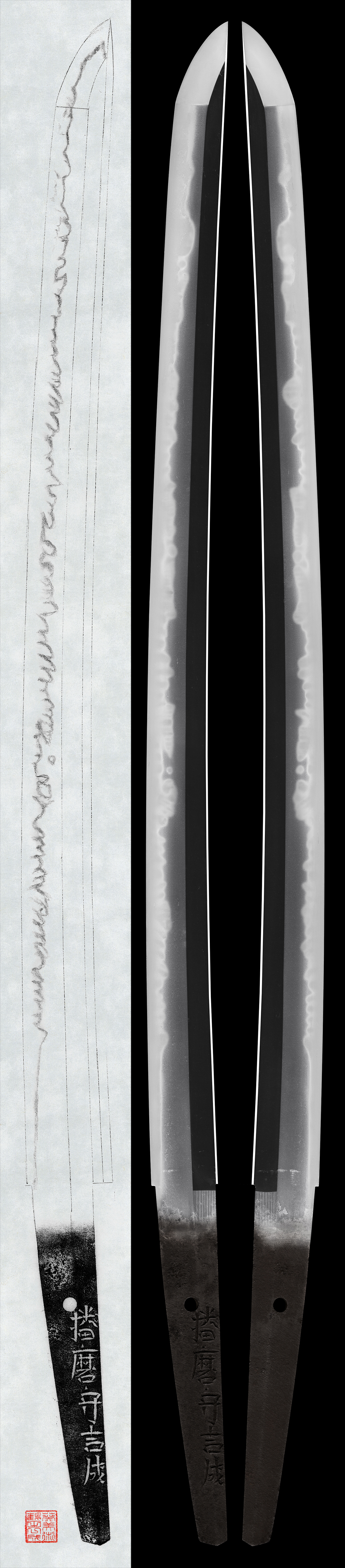 Shape: A well-balanced wakizashi with wide mihaba, thick kasane, shallow curvature, and an extended kissaki.