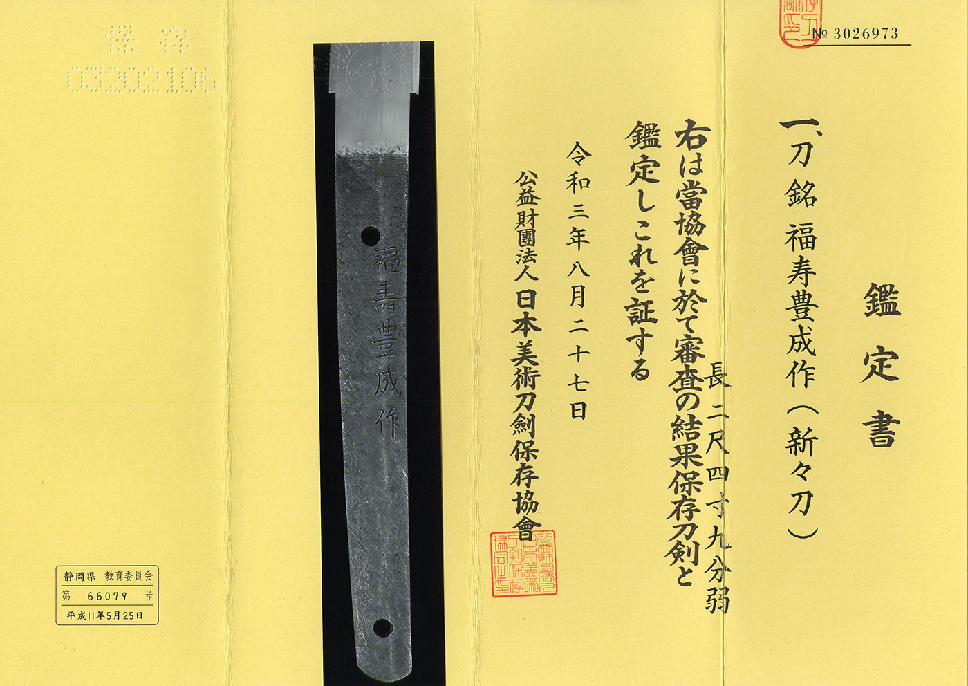 The signature “Fukujyu Toyonari” is unkown, and the sword has been certified as a Hozon Token by NBTHK as a shinshintō (late Edo period sword).