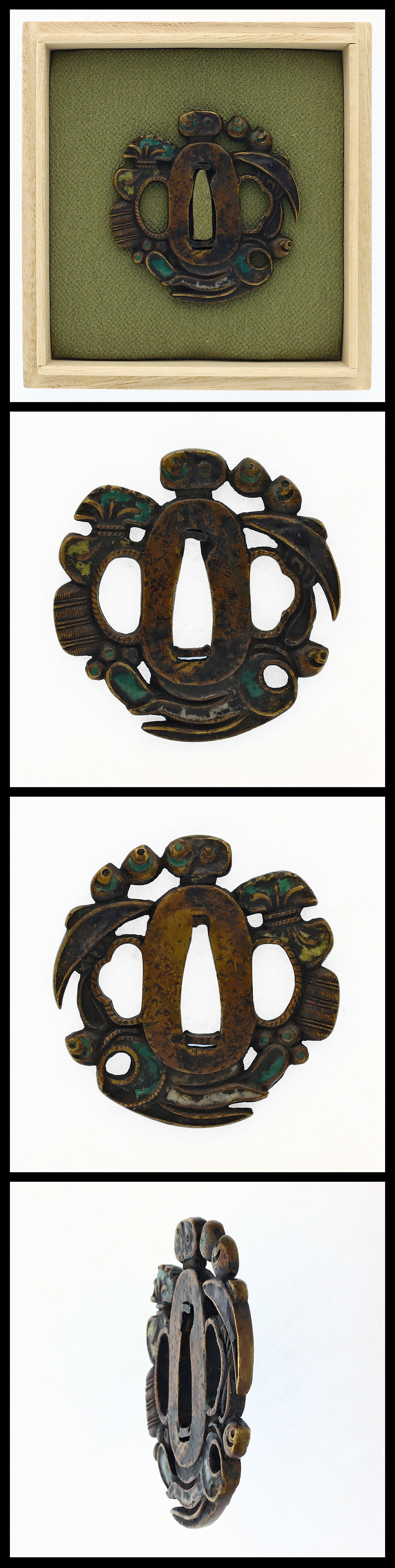 Features: On an irregularly shaped copper base, the design features a takaramono (treasures) motif expressed in cloisonné enamel (shippo).