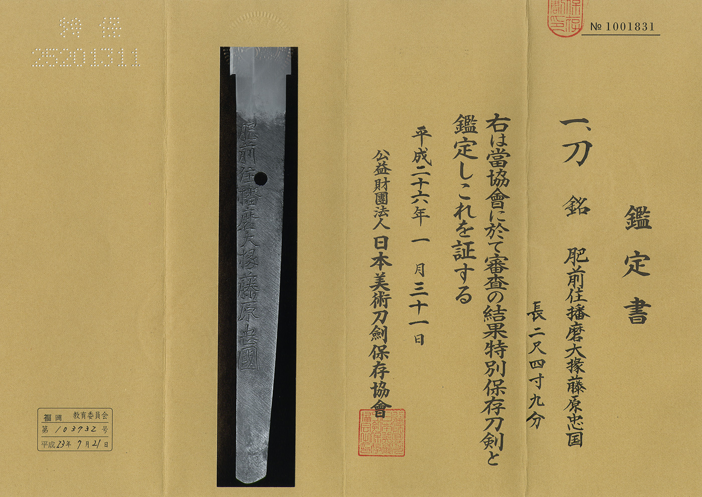 Inscription: Hizen Ju Harima Daijyo Fujiwara Tadakuni 肥前住播磨大掾藤原忠国