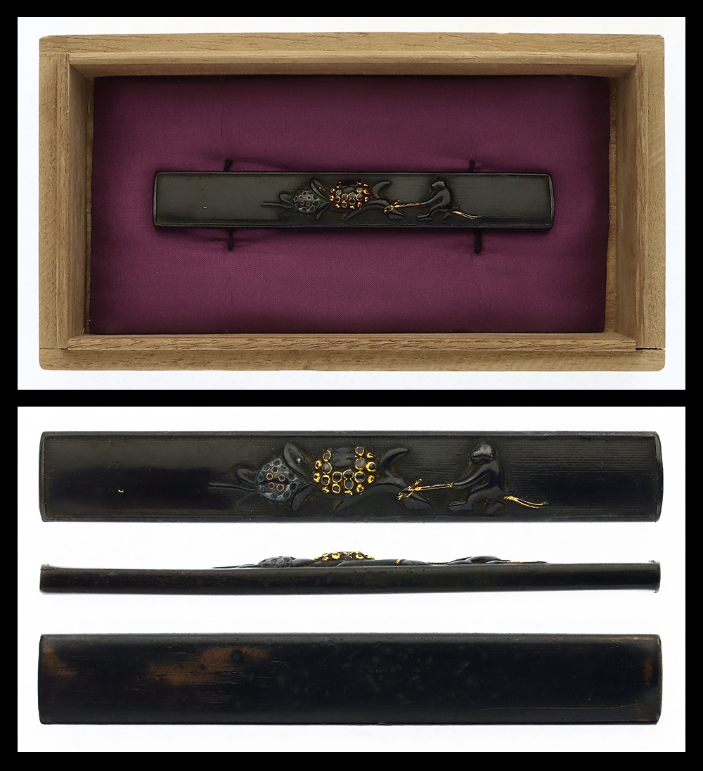 Era: the Edo period Features: Motif of a monkey pulling a plant is carved on Shakudo base.