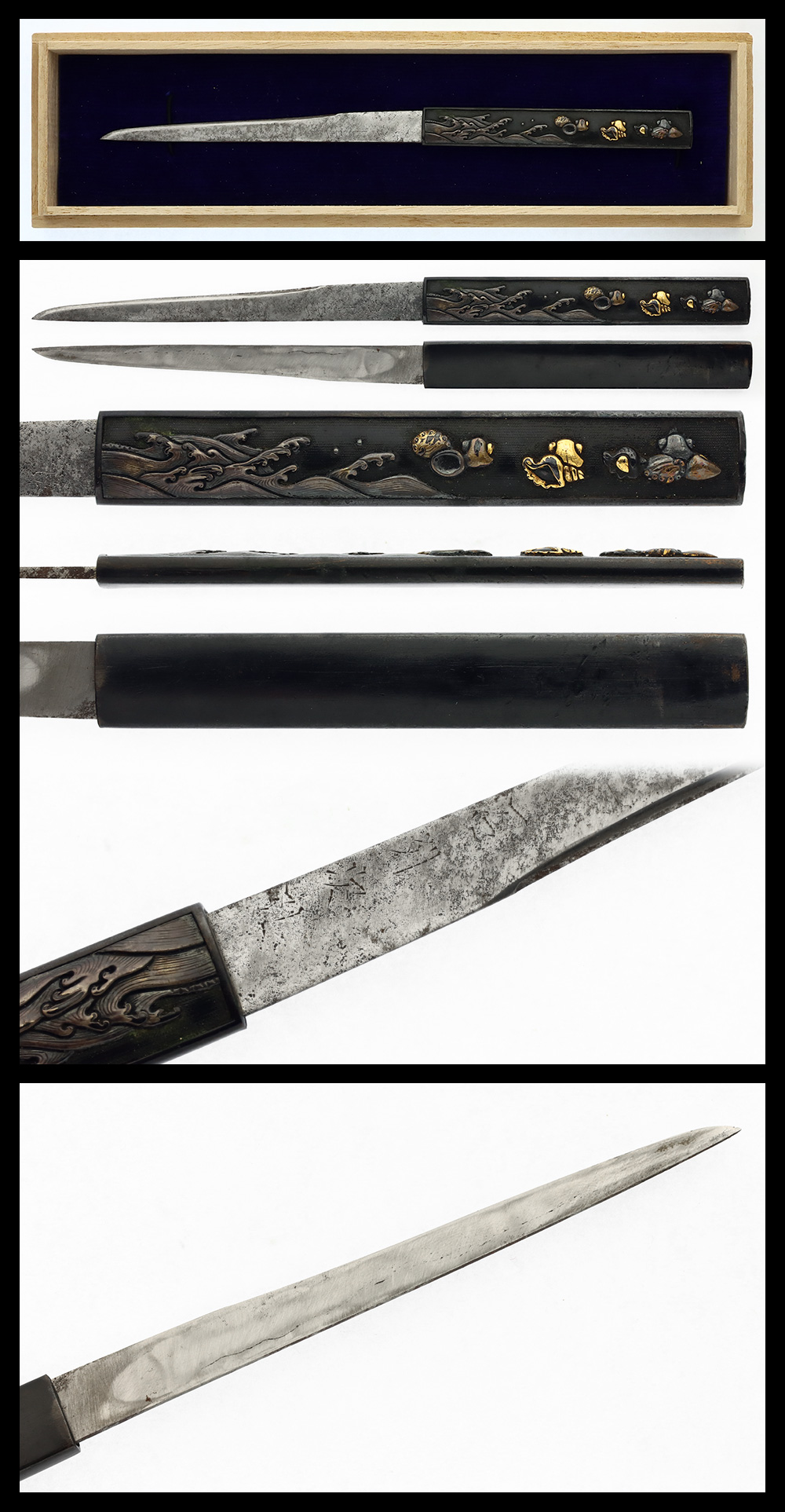 Features: A high-relief and iroe (colored) carving of shells and crashing waves on a shakudō nanako ground.