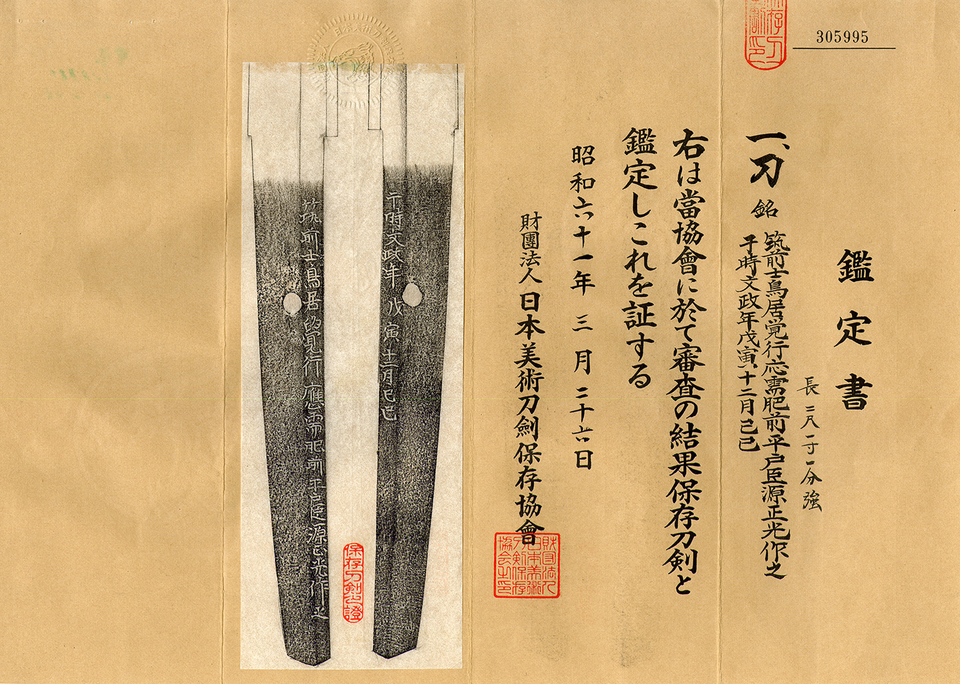 Translation: Made by Masamitsu, a retainer of Hirado in Hizen Province, at the request of Chikuzen samurai Torii Satoyuki, on a day marked Tsuchinoto-Mi (己巳) in December, 1818.