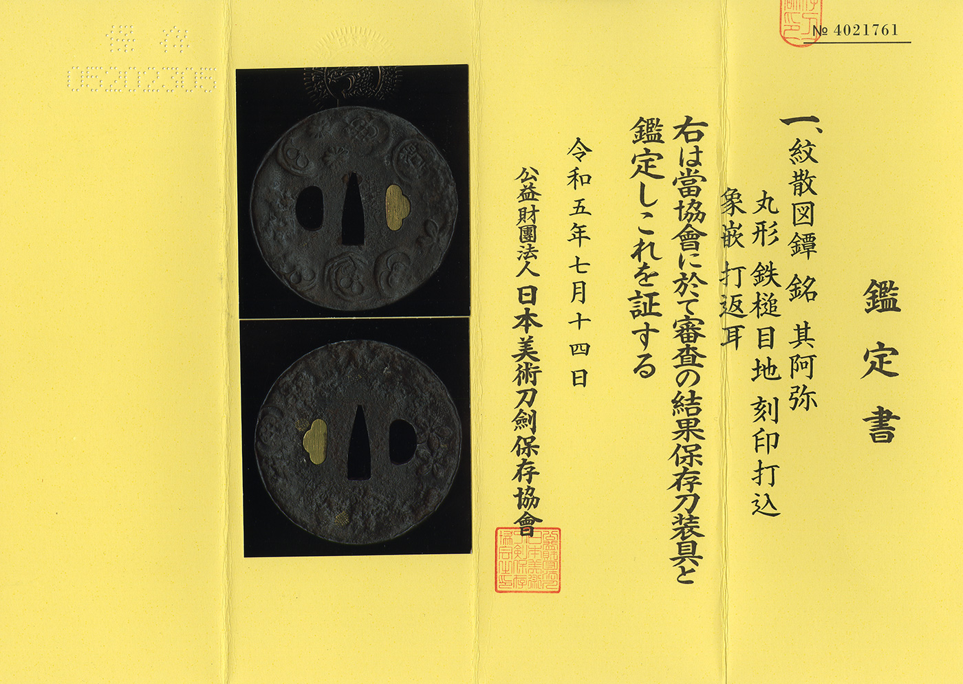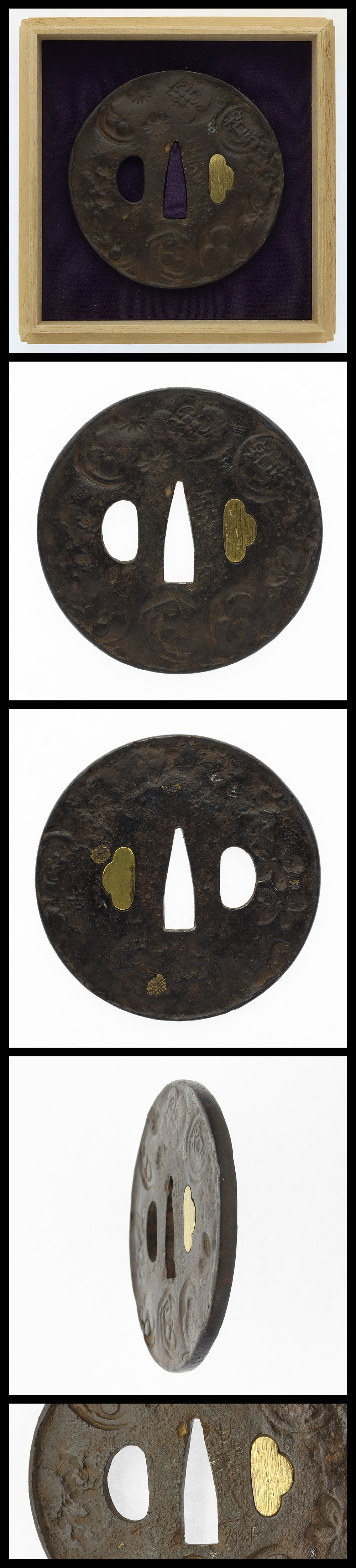Features: A circular iron surface with hammer texture is engraved with a scattered family crest pattern and inlaid.