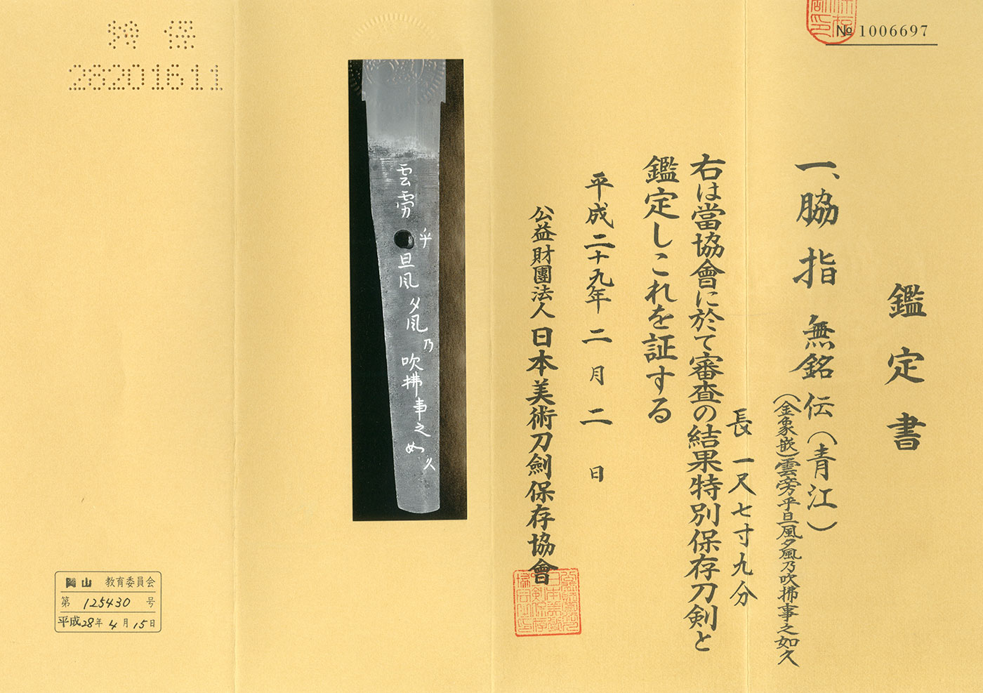 Features: The Aoe school was active in Bitchu Province from the Kamakura period through the Nanbokucho period.