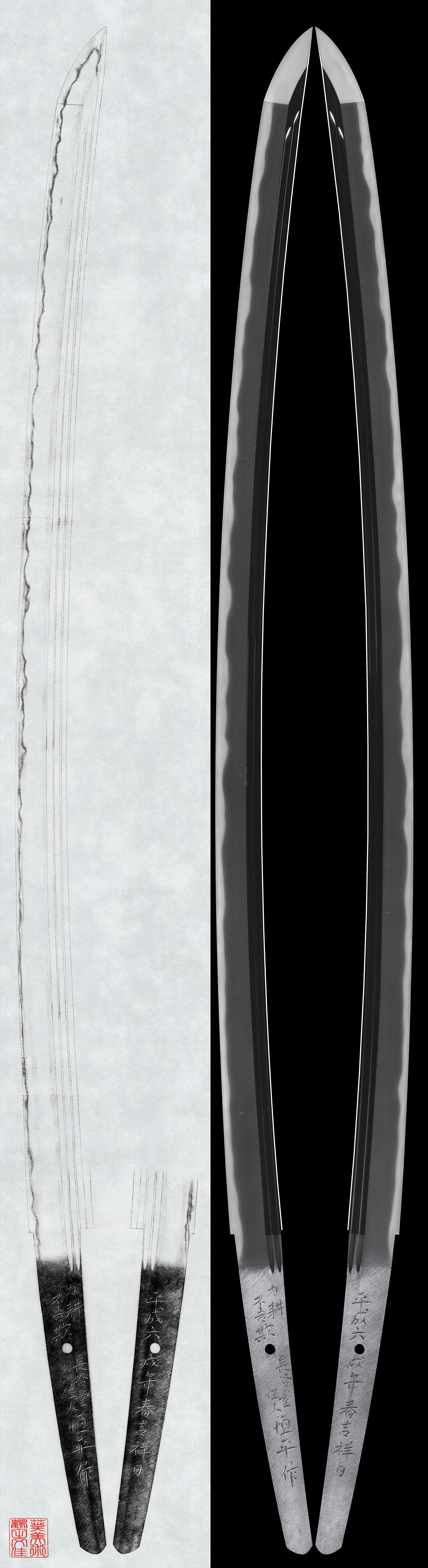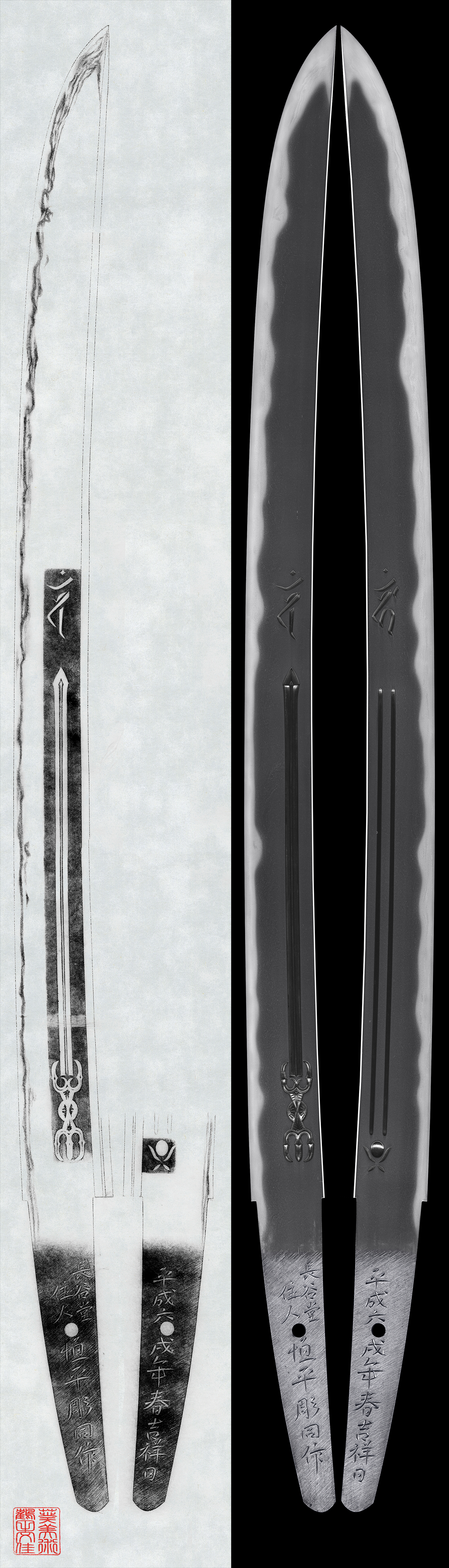 体配:身幅が広く重ね厚く表には独鈷、剣。梵字をほり裏には二筋樋と梵字を彫る。三棟となる。