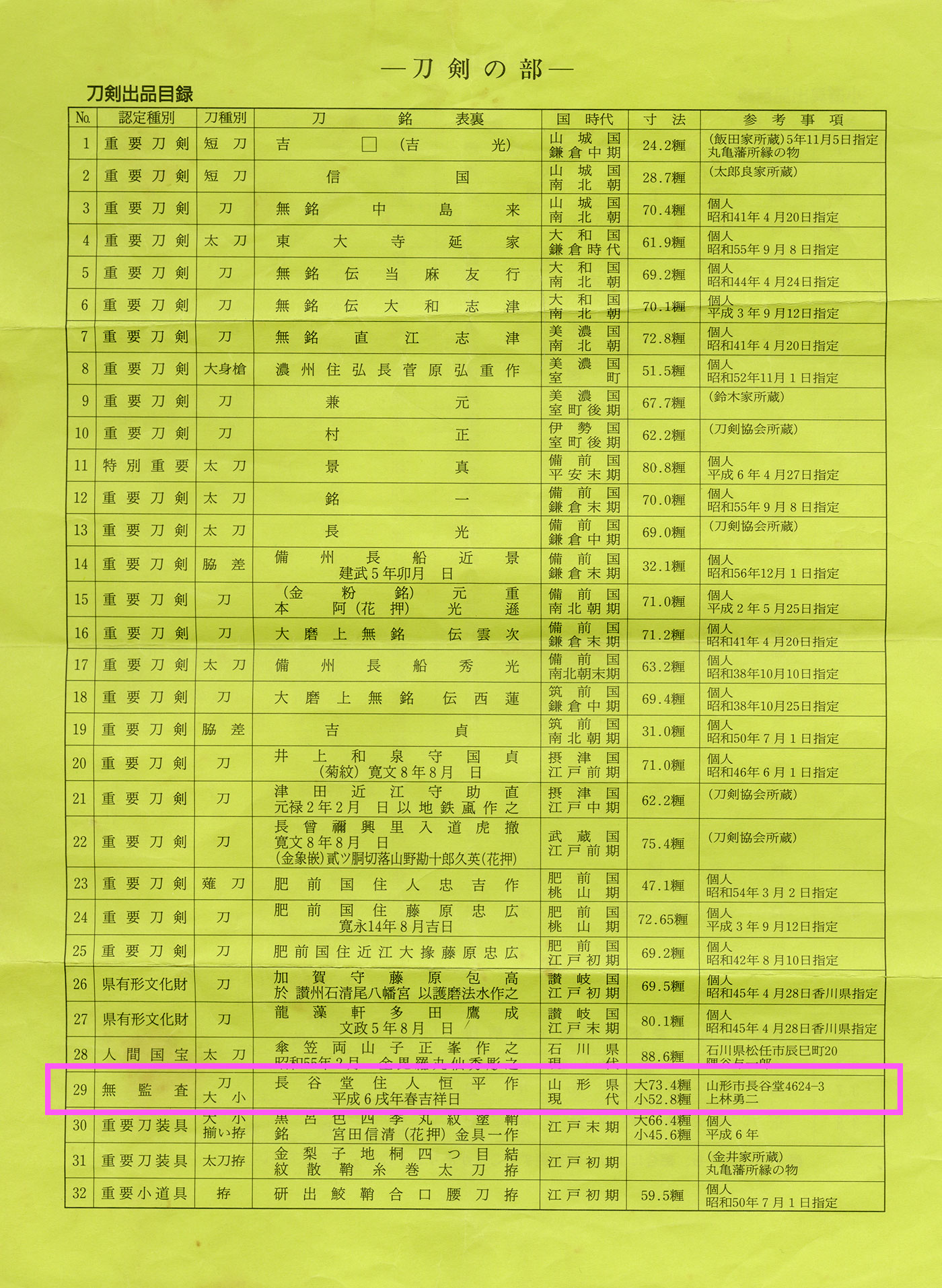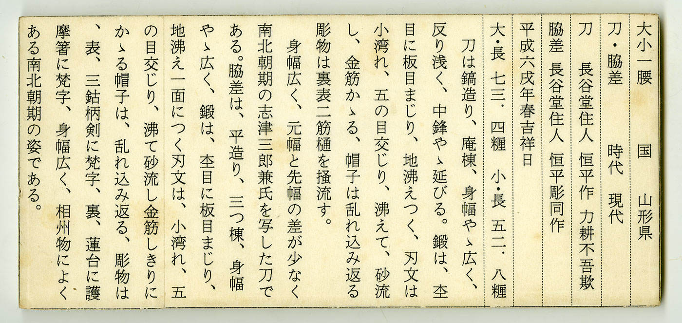 特徴:上林恒平(かんばやし)昭和24年(1949年)山形県に生まれ昭和42年(1967年)当時重要無形文化財人間国宝であった宮入行平に入門し懸命に学んだ。5年後には努力賞、奨励賞、文化庁長官賞・高松宮賞・薫山賞など、数多く獲得して昭和60年1985年に若干36歳で無監査刀匠を獲得した。特に相州伝に強く刀身彫りにも力量を見せる。この相州伝に強いのは師匠に行平の影響によるものと思われる。彼の刀身には長谷堂と茎に記入されるが、昭和61年1986年山形市大字長谷堂に自身の鍛刀場を製作して多くの門人を育てた。平成20年2008年には山形県重要無形文化財に指定されております。力耕不吾欺とは自分が力を尽くせば、望み通りの結果が出るということです。