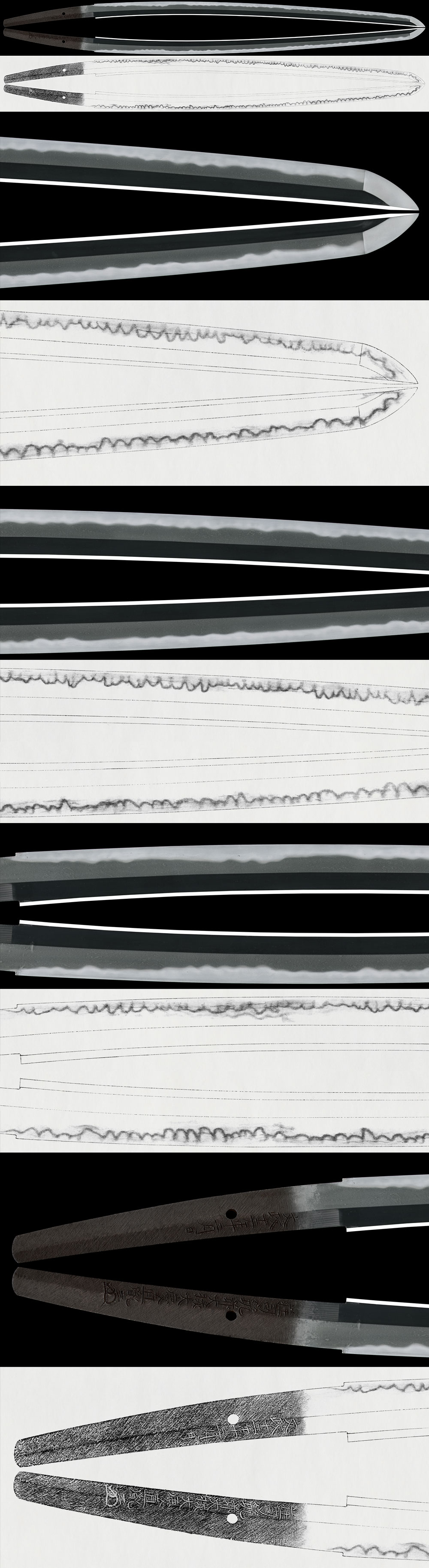 葵美術より一言:彼は年に三度の長旅に出かけていたため、それぞれの地で刻印が打たれている。伊豆の三島大社、韮山、修善寺、遠州浜松、伊勢久居、伊勢神宮を回って江戸に戻るという長旅であった。直胤は備前伝と相州伝がありますがどちらも上手で本作のごとく備前伝の作品には映りのある作品が多いです。本作も同様ですが江戸時代末期の作品としては大変珍しいと言えます。