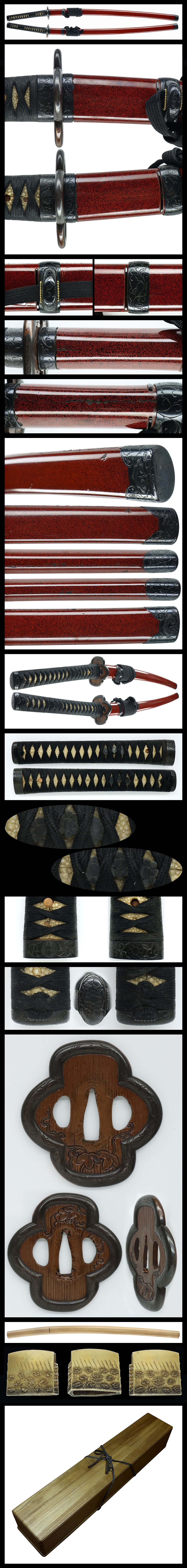 鍔:四つ木瓜形の赤銅鍔。紋様を刻み、中央部に素銅を用いて植物と模様を施す。