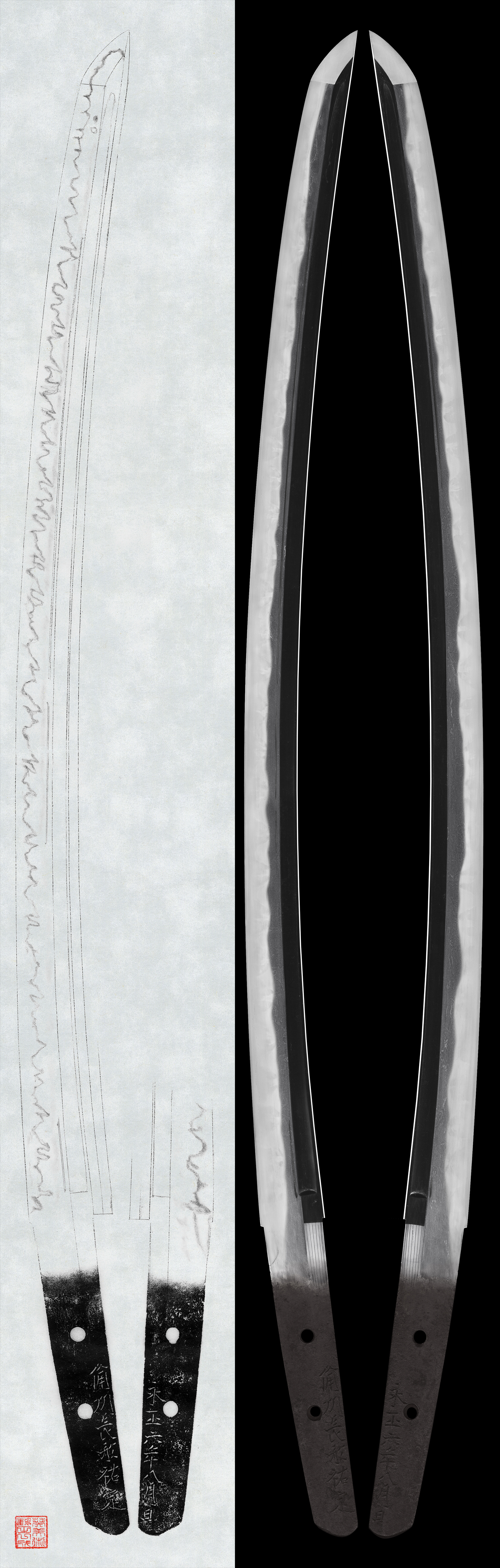 体配: 身幅尋常で重ね厚く反りが深く付いた作品で、表裏に棒樋と添え樋を掻く。