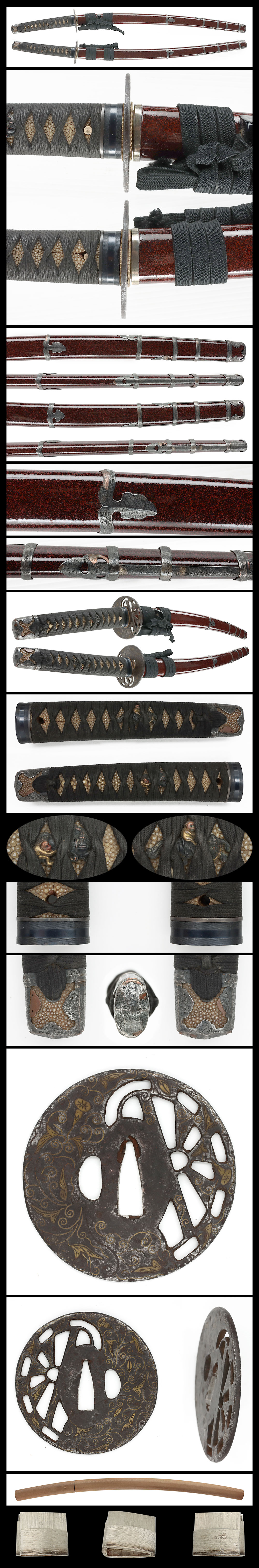 鐔: 円形の鉄透かし鐔に朝顔に似た植物を真鍮象嵌する。