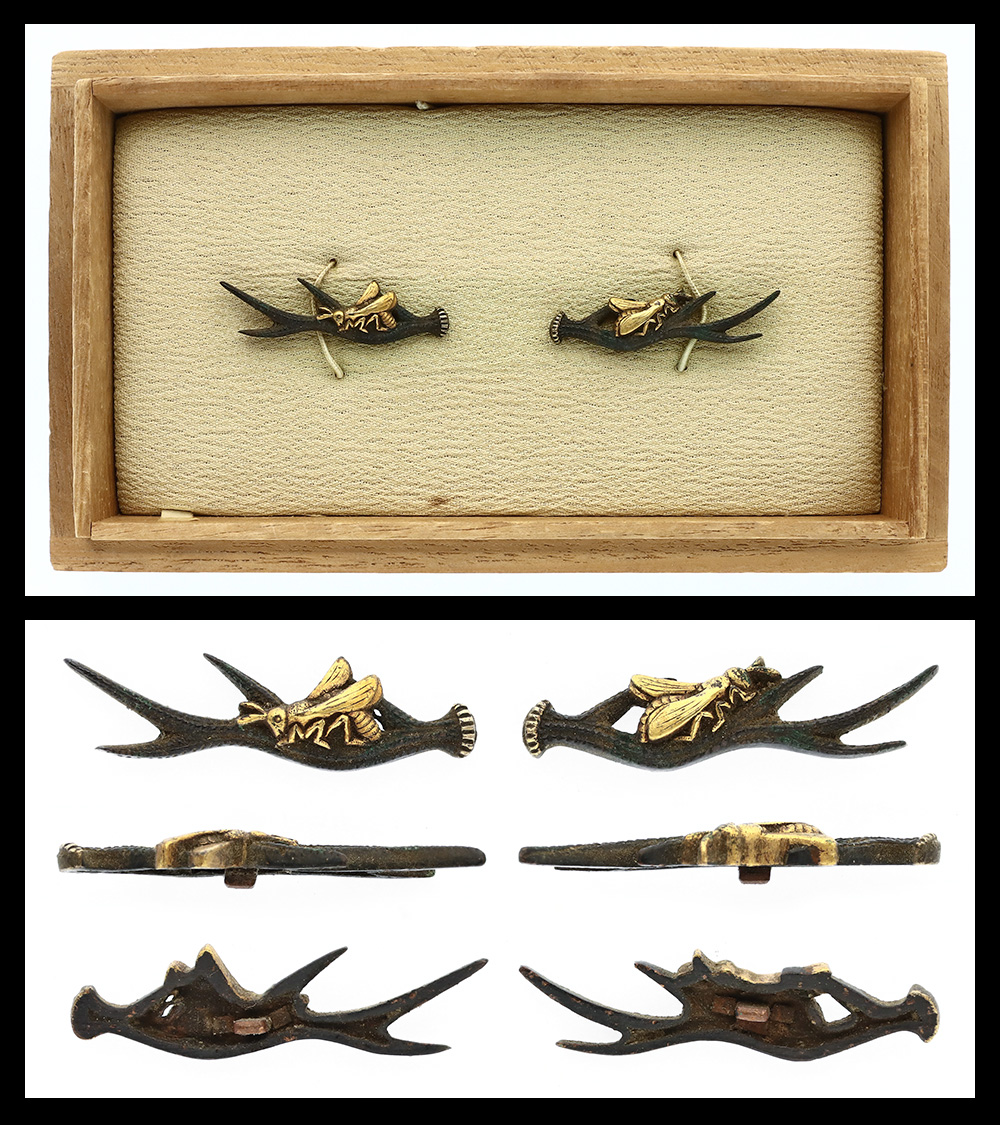 特徴:赤銅地にバッタの図を形彫り金色絵を施す。