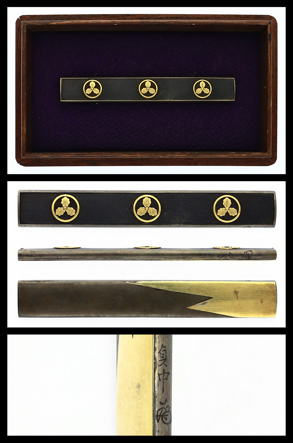 特徴:赤銅魚子地に丸に三つ柏の紋を彫り金色絵を施す。裏は四分一と真鍮地。