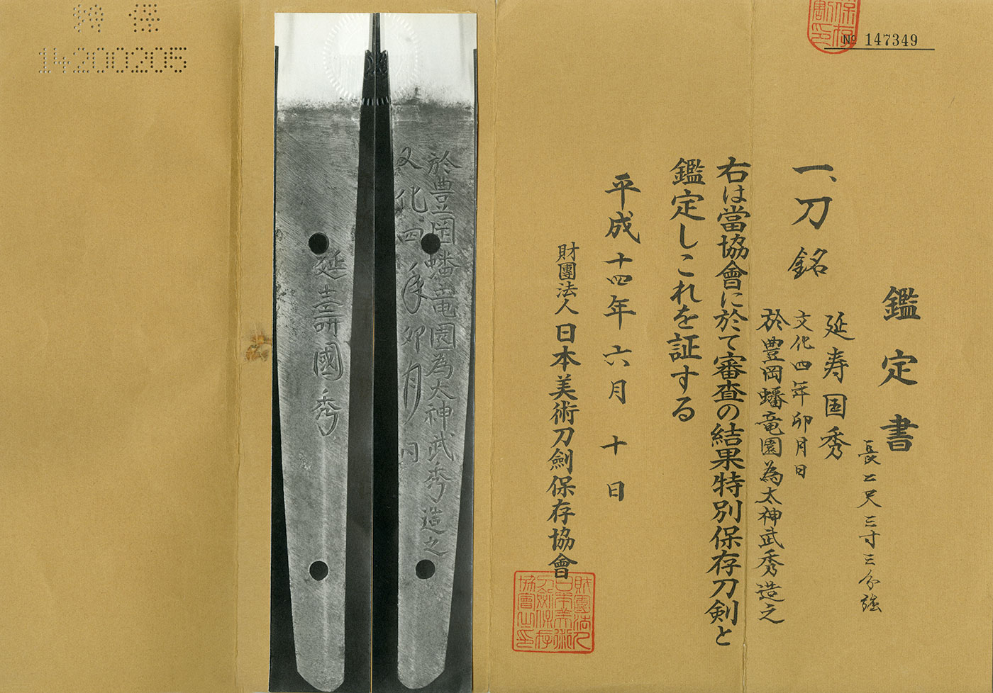 国秀に製作を依頼した。延寿国秀は縁起の良い刀として知られております。禄高は低いが大名の位であり、廃藩置県後は大いに活躍したと言われております。大名家の注文として製作した見事な刀ですぜひお勧めしたい作品です。