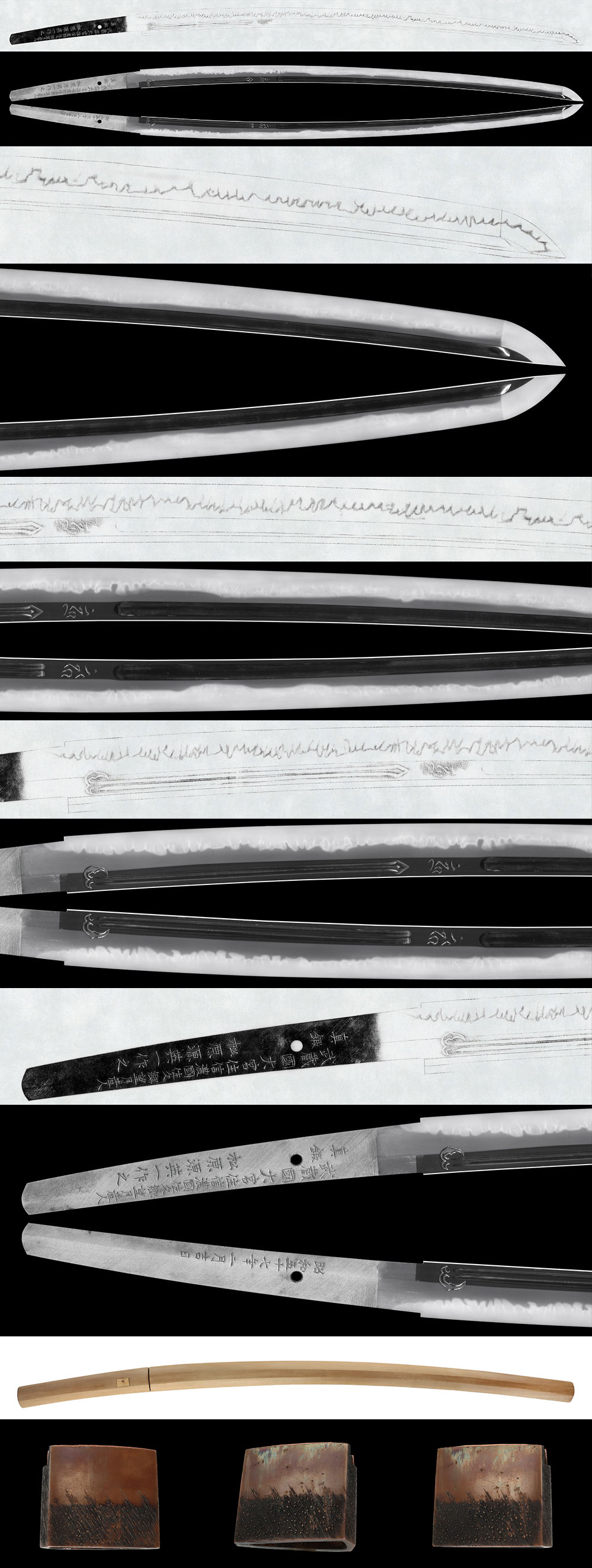 体配: 身幅が広く、重ね厚い長寸で生刃が残った健全な作品で、爪、梵字、二筋樋を彫る。