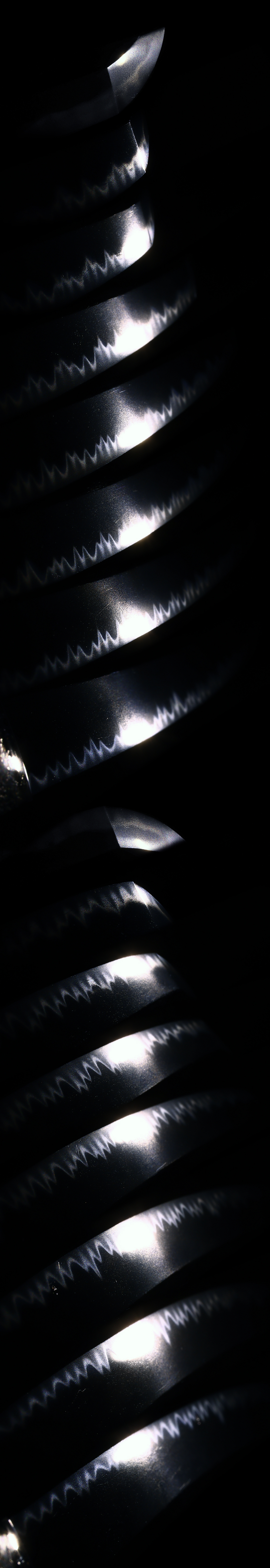 刃紋:品位のある三本杉すなわち尖互の目となり、刃中、砂流、金筋が働く。帽子乱れ込んで先尖って返る。