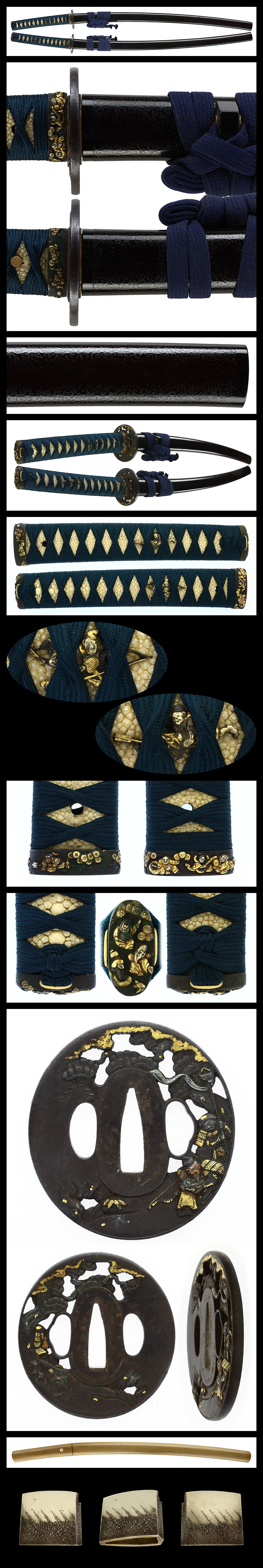 鍔:円形の鉄鐔に武者と松の木を透かし彫りし金銀銅で色絵をほどこす。