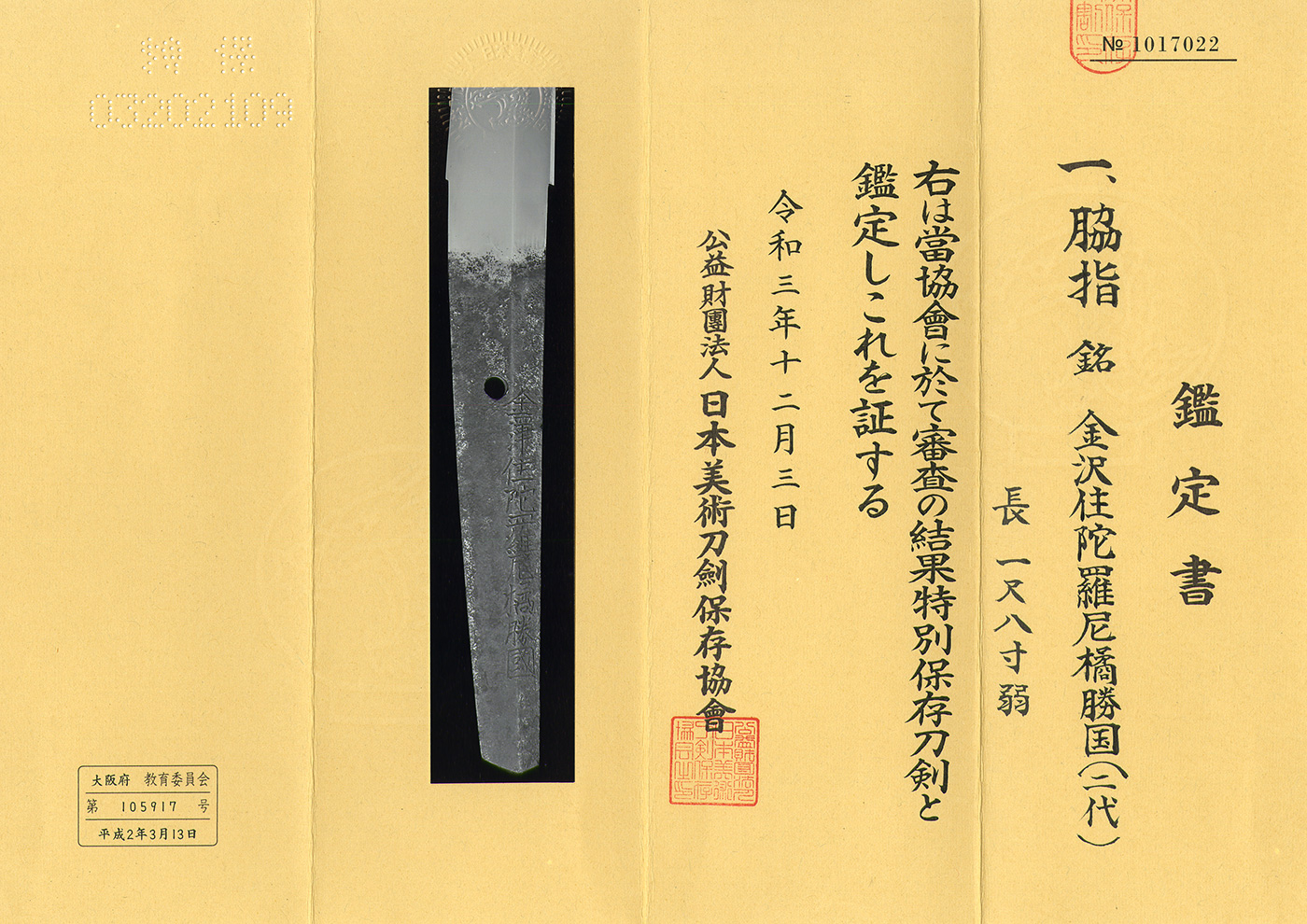 脇差:白鞘入り、拵え付き(特別保存刀剣)