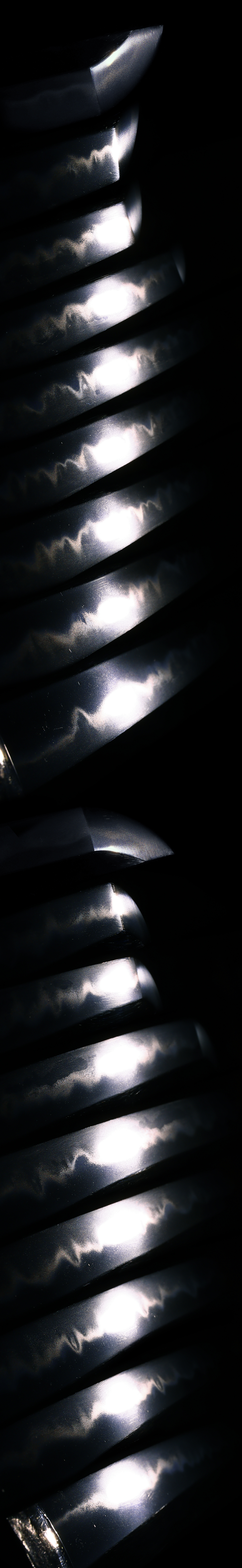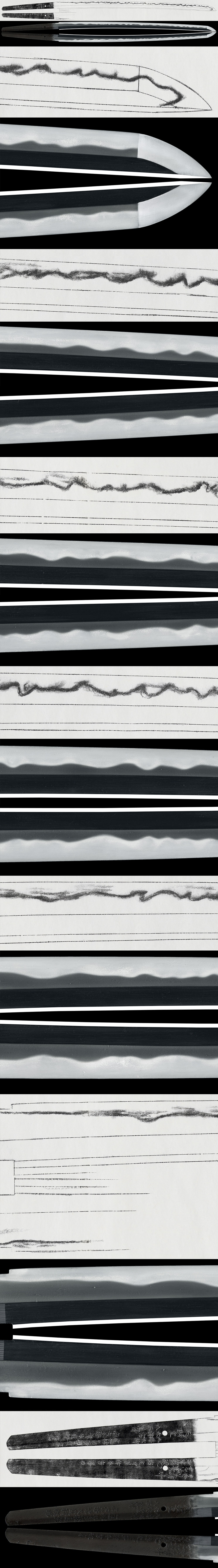 体配: 身幅が広く、重ね厚く、反りが浅く、鋒が伸びて茎が長い。