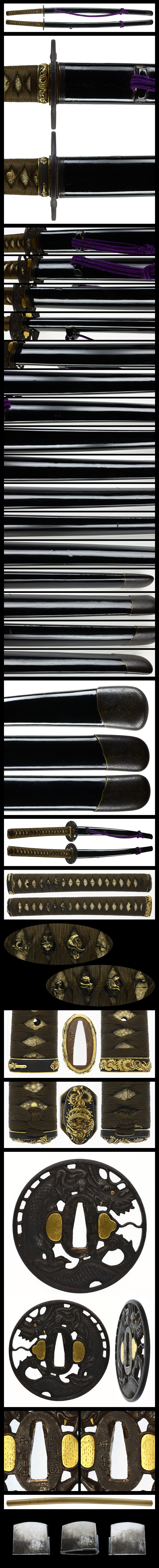 縁頭: 赤銅魚子地に龍を高彫りし金色絵をする。
