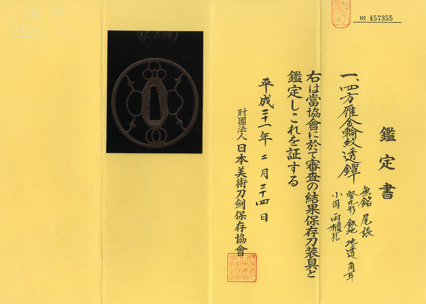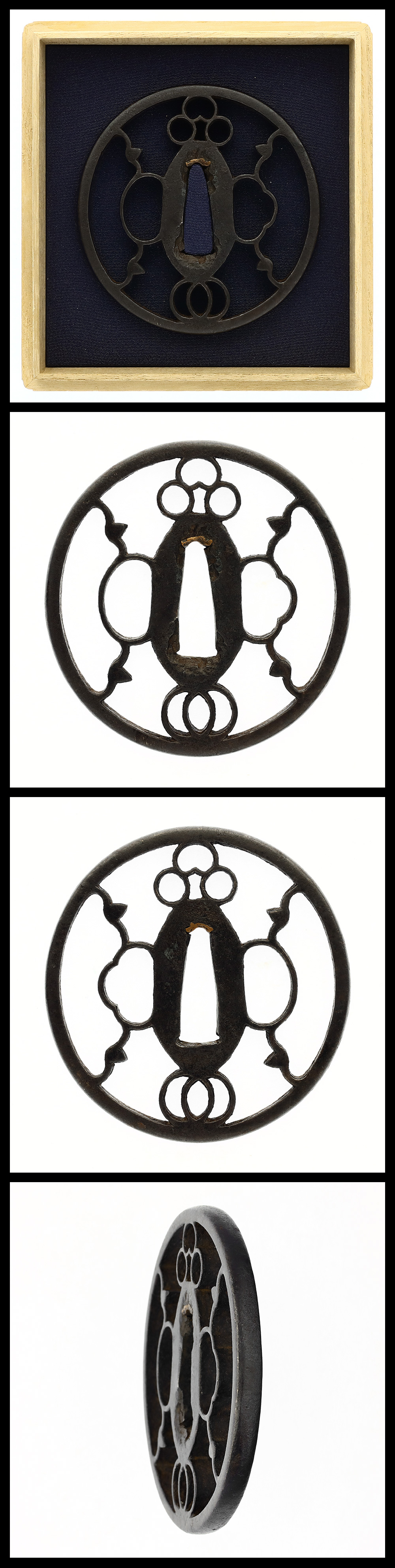 特徴:竪丸型の鉄地に四方雁金輪紋を透かし表す。