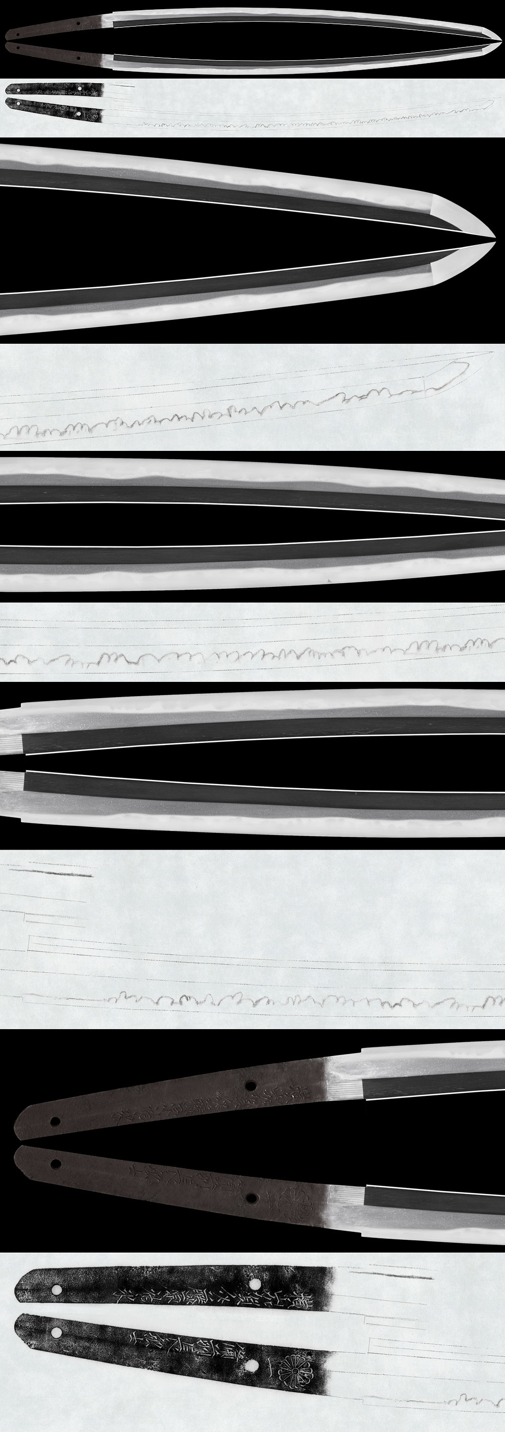 (菊紋)一備前長船士と切る。横山加賀介藤原祐永、横山祐包はこの締まり心の互の目、丁子乱れが上手で魅力のある作品を製作する。
