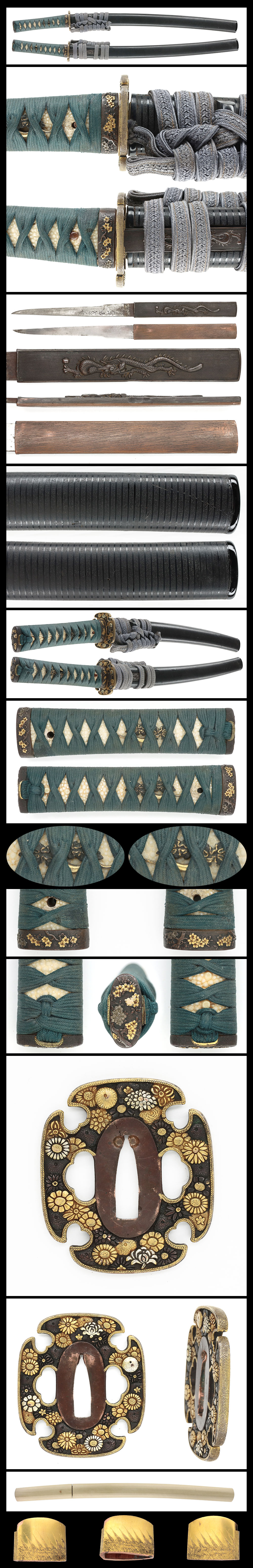 鍔:赤銅魚子地の太刀鍔に花の図を彫り金色絵。