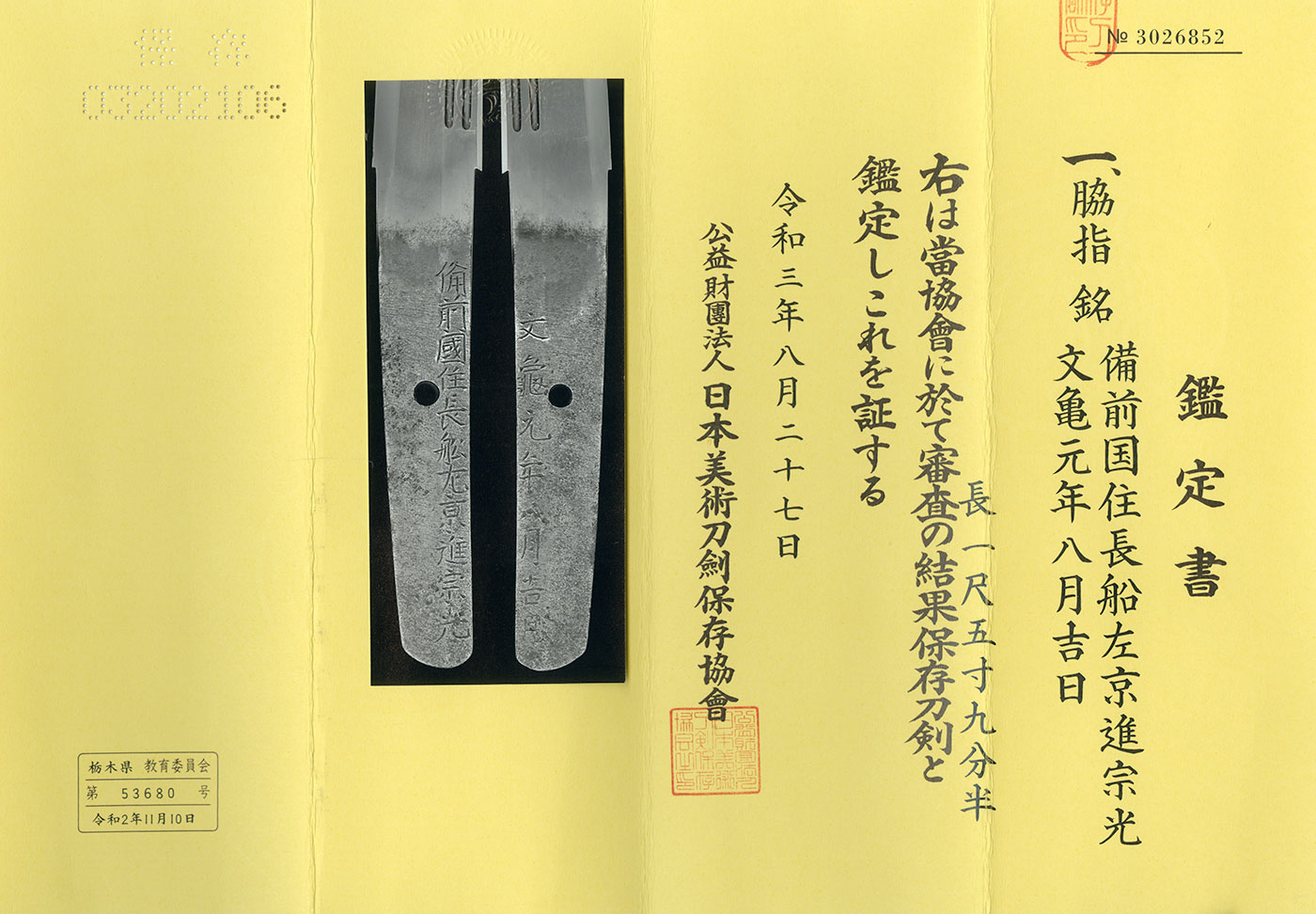 特徴:俗名入りの備前國住長船左京進宗光で六郎左衛門祐光の次男に当たり合作を残す。美作城主赤松政則に刀剣鍛錬を教授する。作品は短めのものが多い。