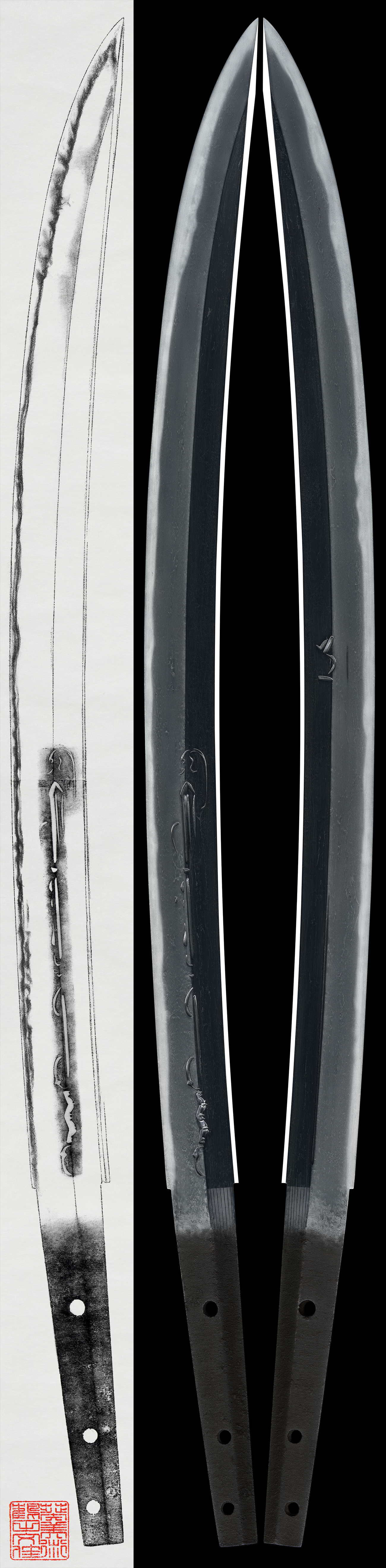 体配:鎬重ね厚く、反り尋常な薙刀直し。梵字、三鈷杵剣を彫る。