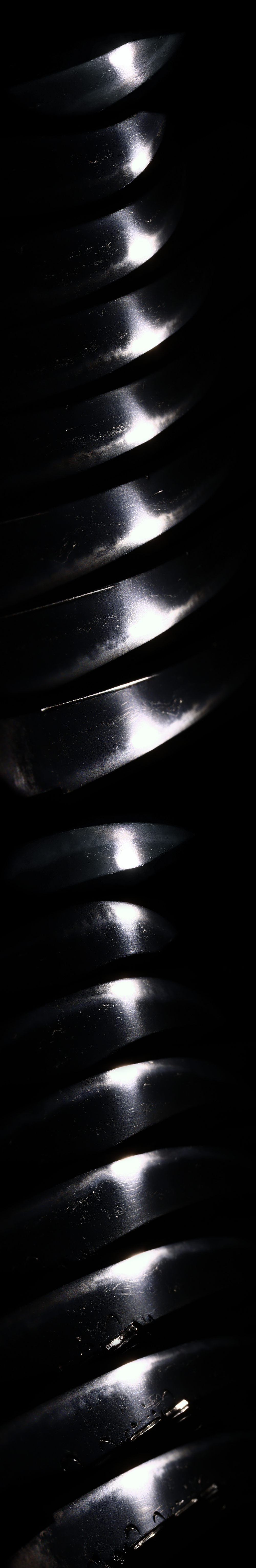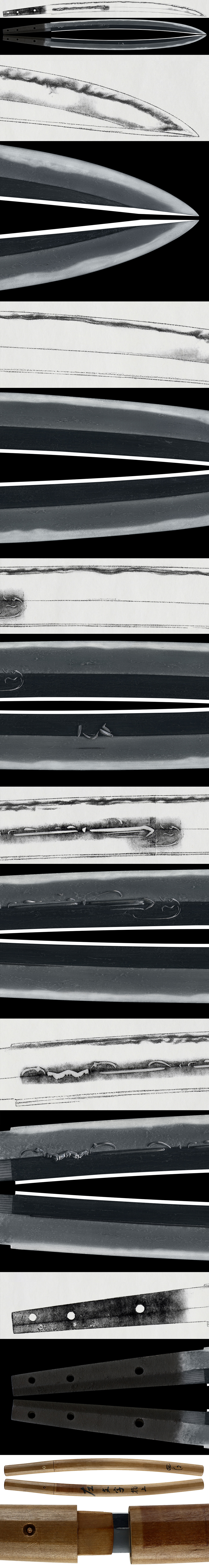刃紋:沸出来逆さ丁子に湾混じり砂流し・金筋かかり蝋燭帽子のように先尖り帰る。