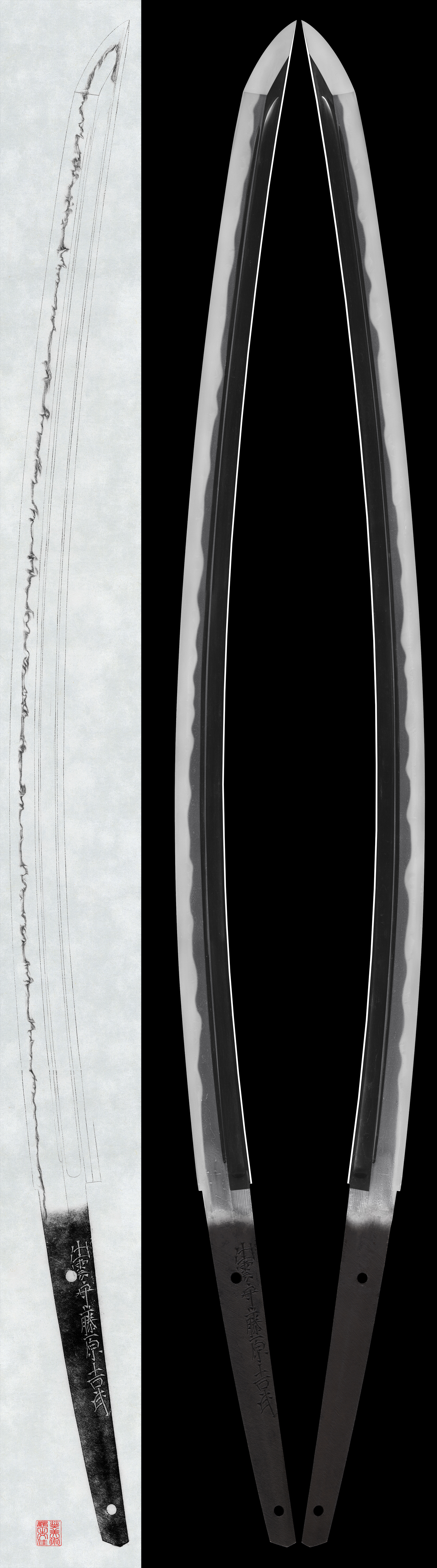 特徴:この作品は大変珍しい作品で鋒が長く伸びて、反りも3cmもあり、さらに表裏に生と思われる棒樋と添え樋を見事に彫る。
