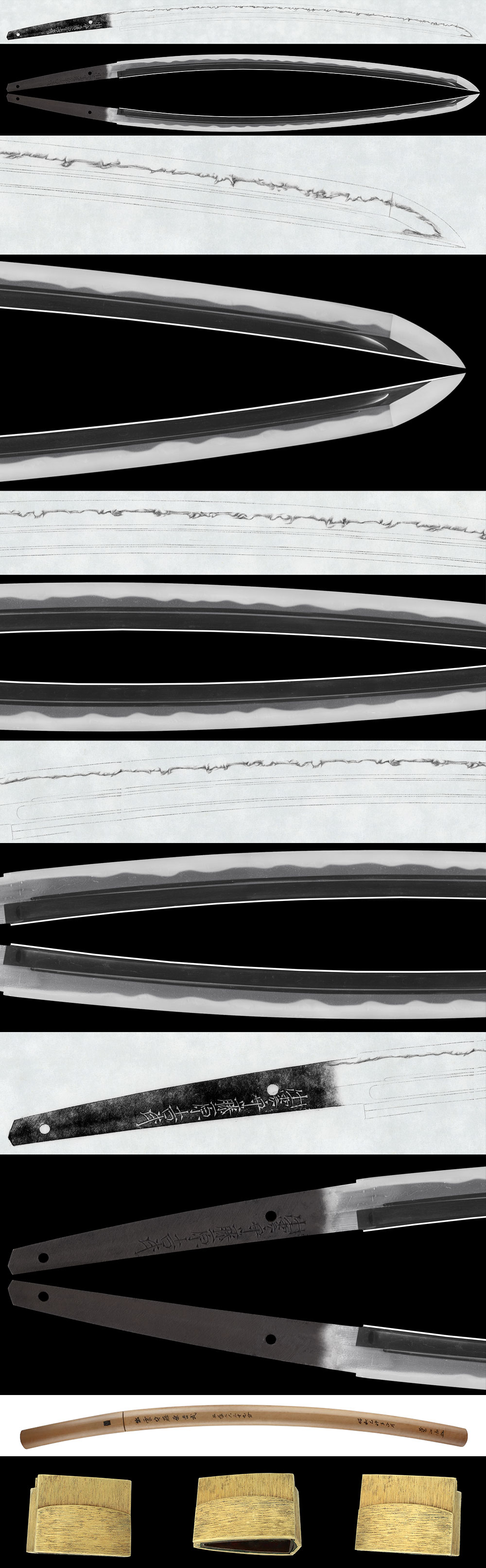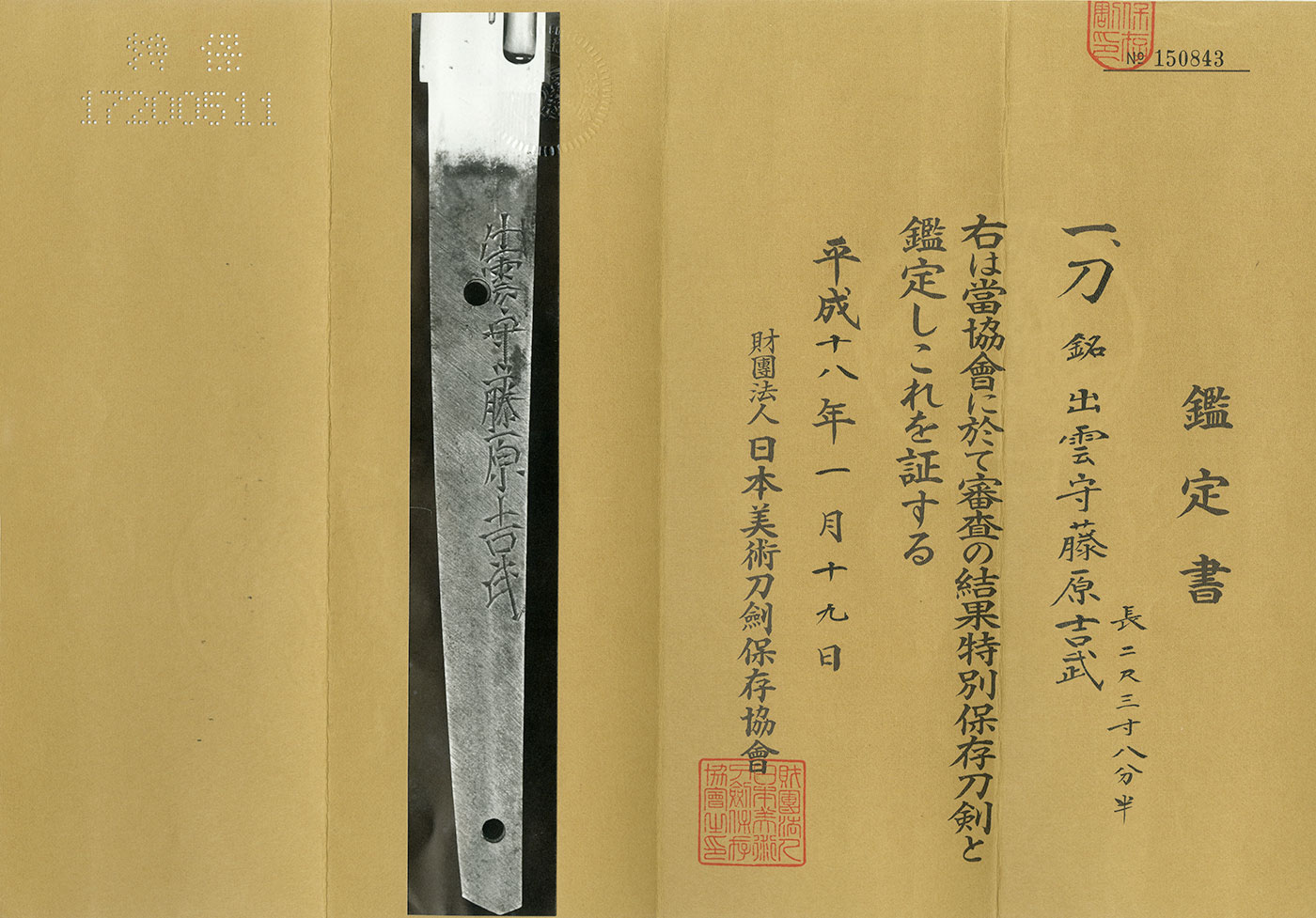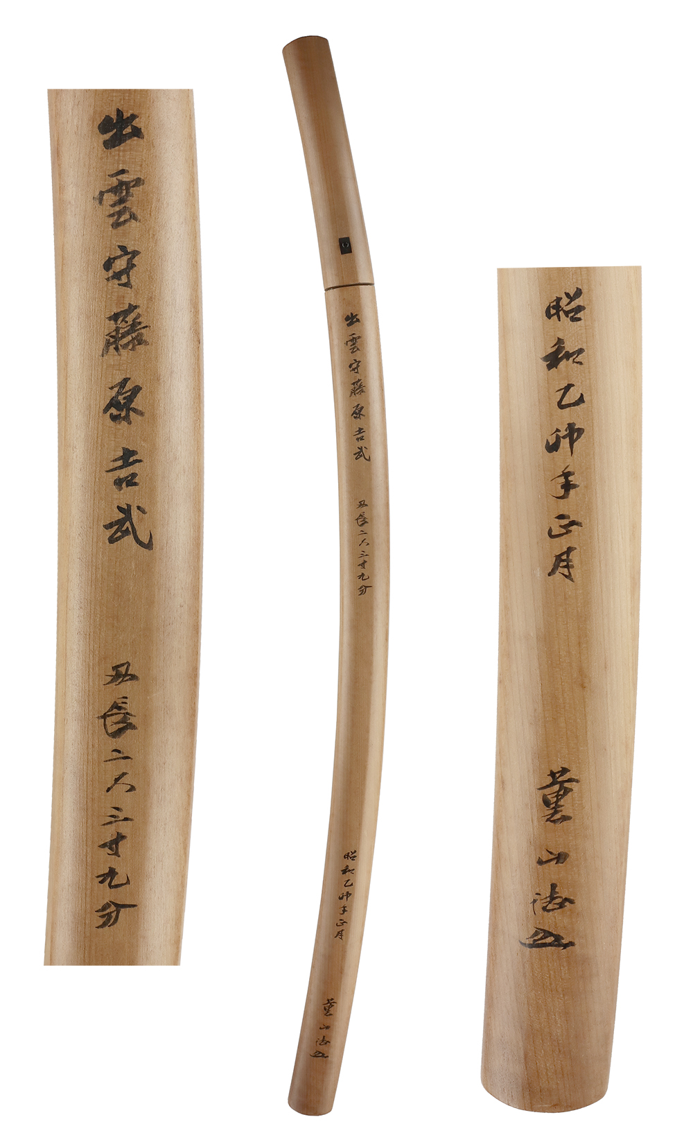 葵美術より一言:この作品は出雲守藤原吉武の初代銘の作品です。二代も「守」という文字は使いますが、ほとんど譜銘がつきます。 初代銘のほとんどは大掾を使用しますが、後期になると「守」を使います。まずこの作品は反りが深く、棒樋と添樋を綺麗に製作し、鋒が伸びて綺麗な姿をした作品です。薫山博士の鞘書きがあり、重量も875グラムもあります。見事な作品であります。おそらく特別に製作されたのであとうと想像いたします。ぜひお勧めしたい見事な作品です。