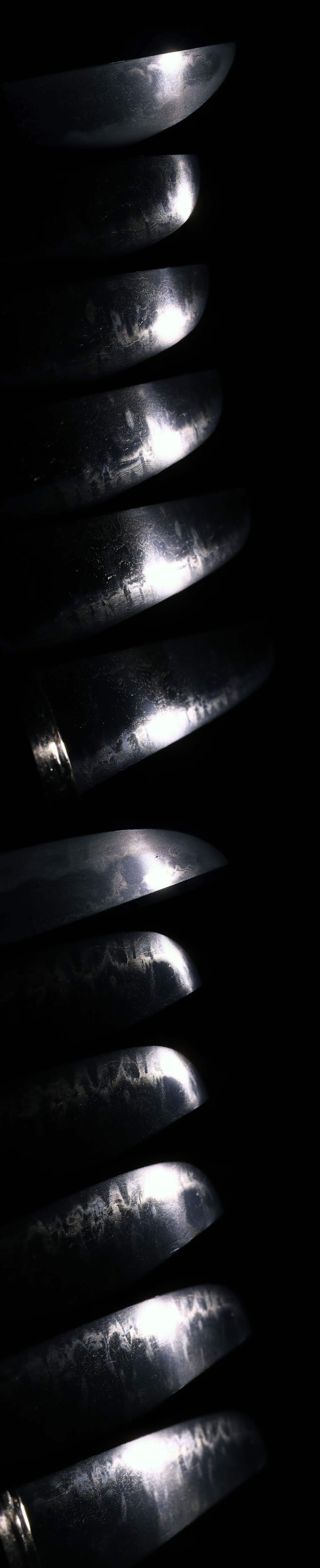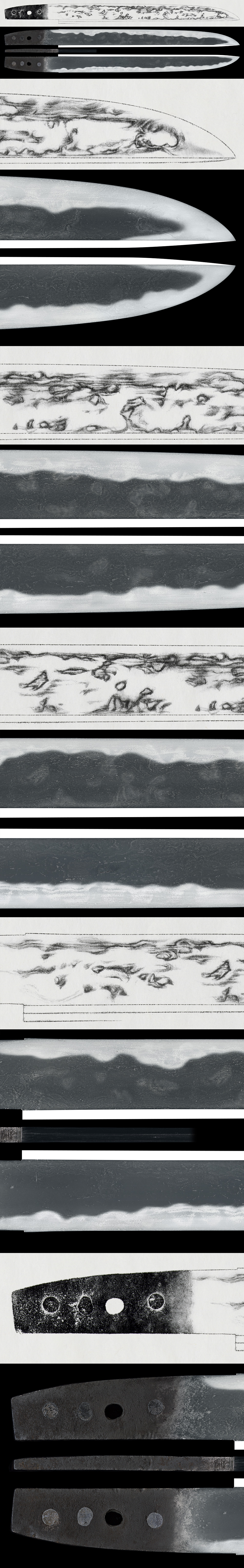 刃紋:小沸出来、皆焼の刃紋。互の目乱れが刃の左右に現れ中に飛び焼きが入る。刃中、砂流、金筋が働く。