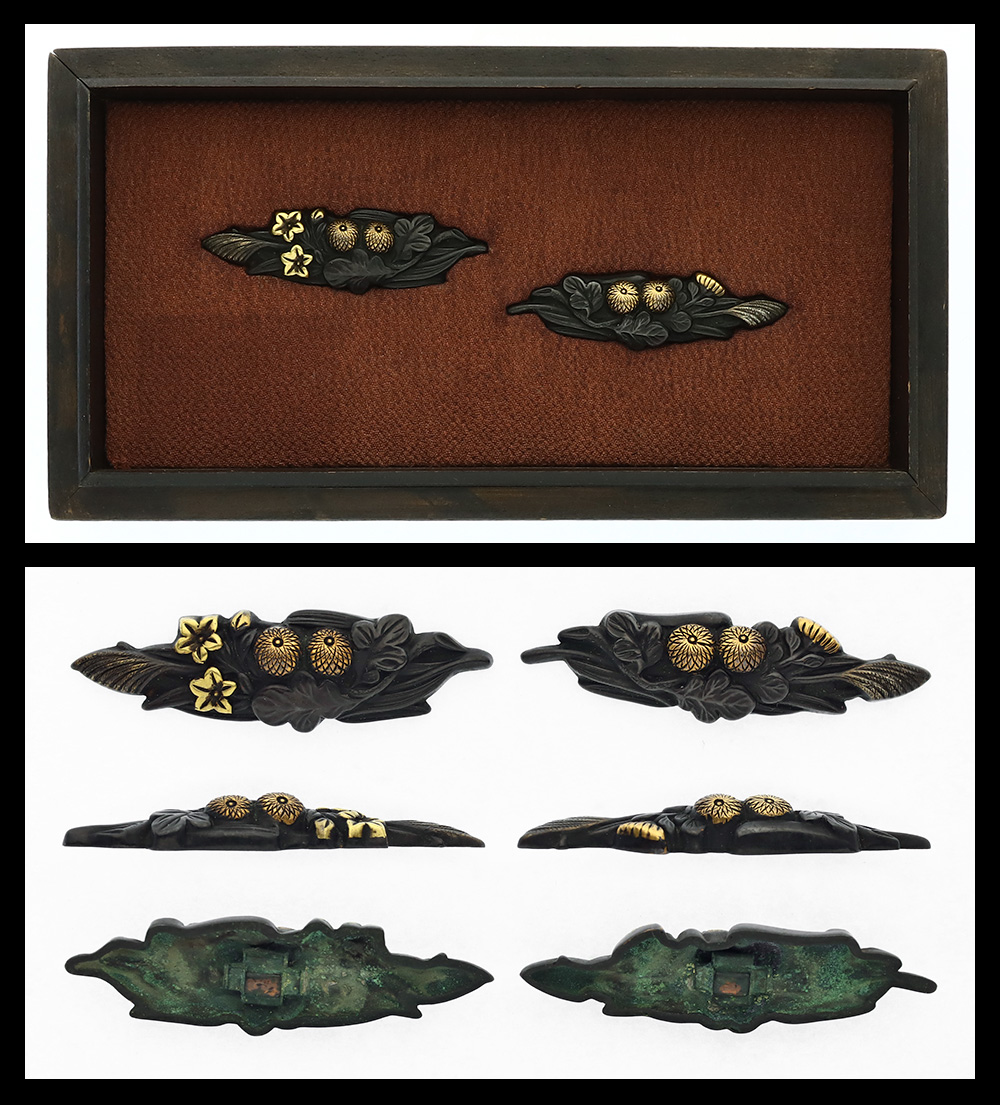 特徴:赤銅魚子地に菊花の図を容彫り、金銀色絵を施す。