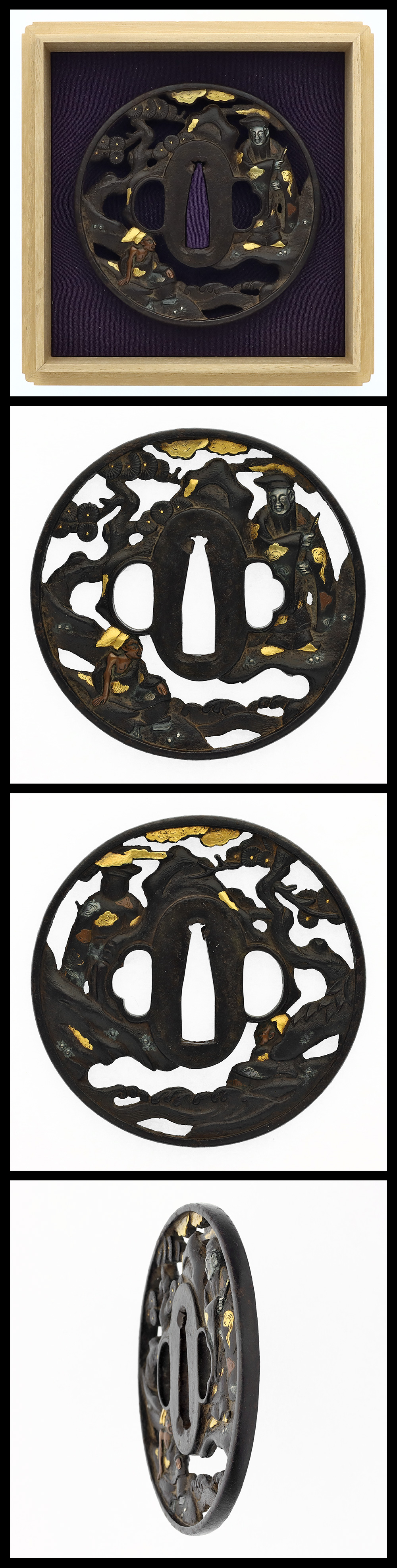 時代:江戸時代 特徴:丸形の鉄地に肉彫り松下唐人物図を地透素銅象嵌、金銀布目象嵌をする。