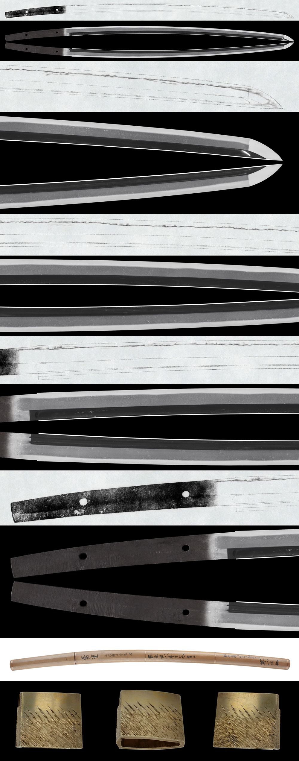体配:大磨上無銘の刀で反りが深く、片面に二筋の樋を彫り、片面には棒樋を彫る。