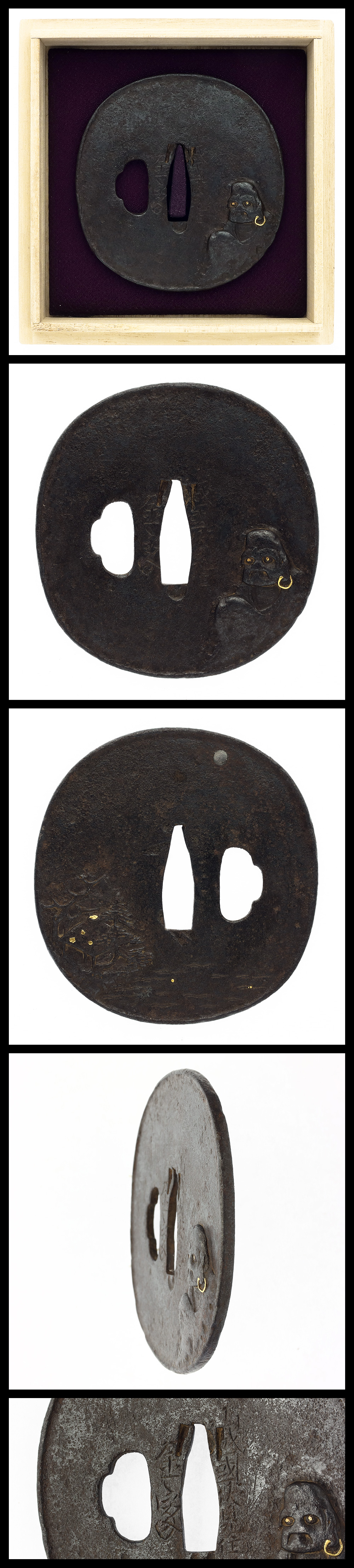 特徴:竪丸型の鉄地に僧侶の図を高彫り、金色絵を施す。