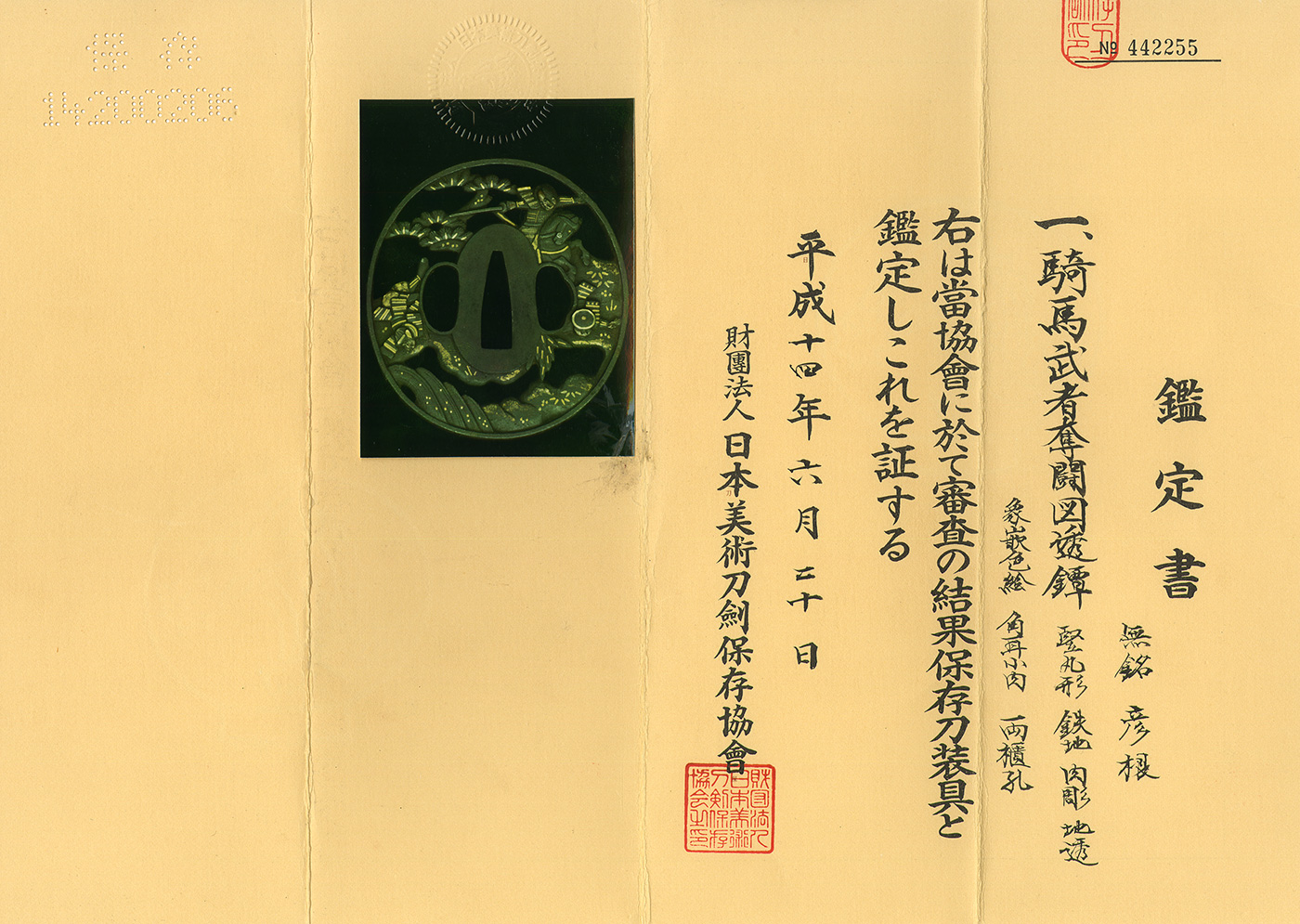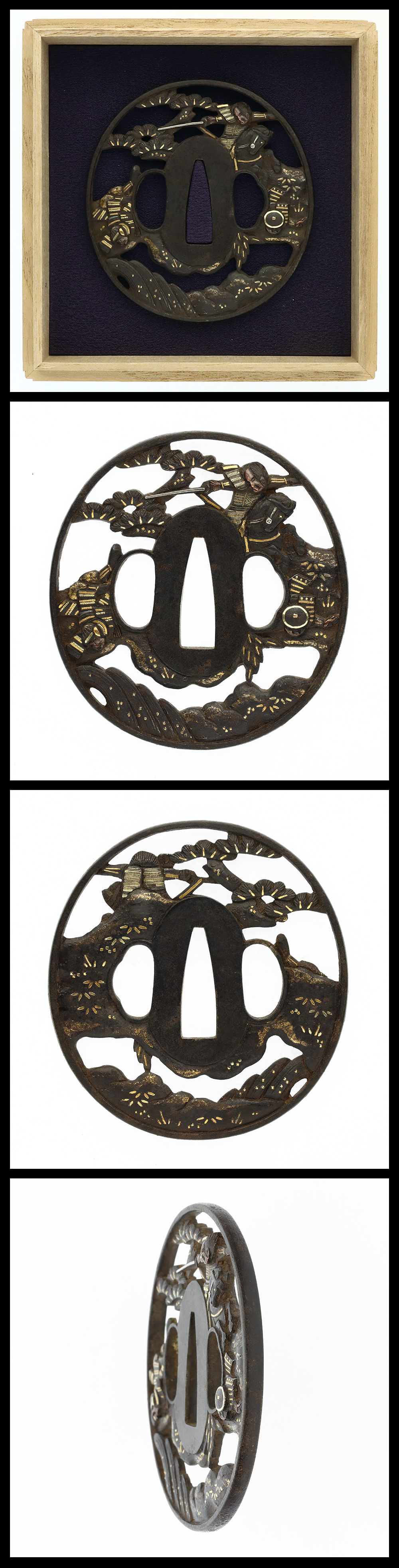 特徴:縦円形の鉄地に騎馬武者奮闘図を透かし彫り金色象嵌する。