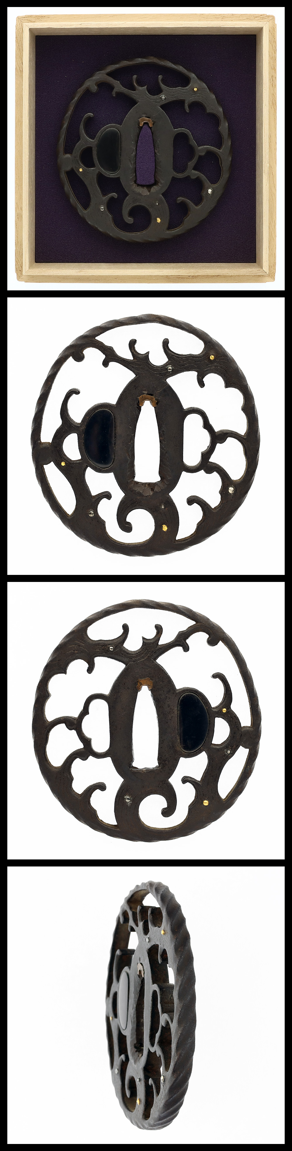 時代:江戸時代 特徴:厚みのある竪丸形鉄鐔に波図を透かし彫りし、耳に縄目をほどこす。