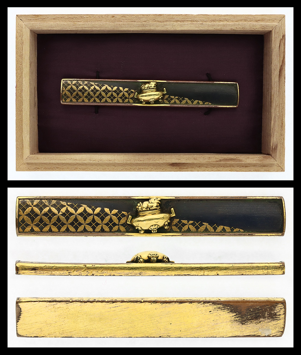 特徴:赤銅魚子地の小柄に香炉の図を高彫りし象嵌をほどこし、七宝文をいれる。